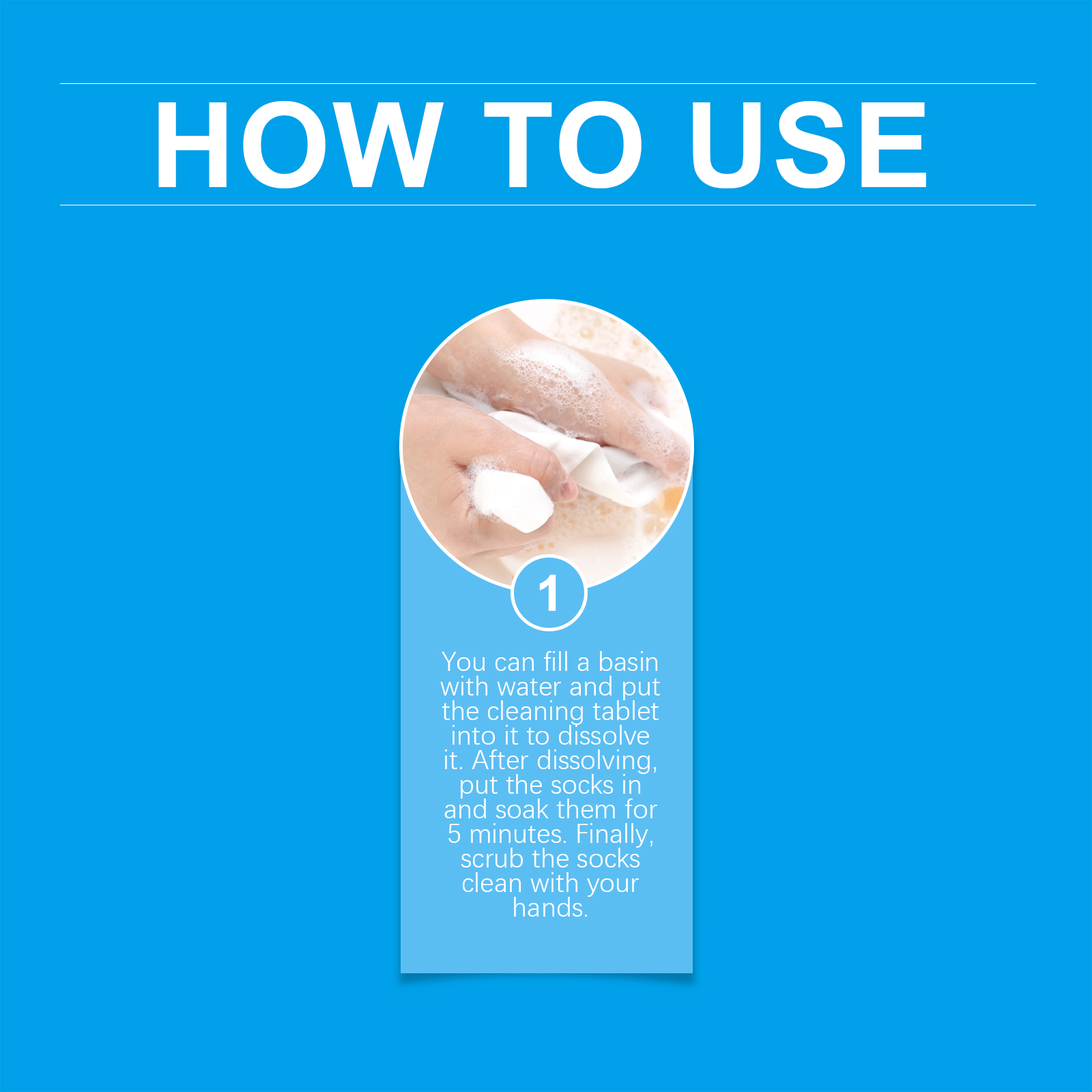 我们的袜子清洁泡腾片含有柠檬酸、碳酸氢钠。它可以快速溶解和深度清洁袜子纤维。它的使用方法很简单:你可以在一个盆里装满水,然后把清洁药片放进去溶解。溶解后,把袜子放进去浸泡5分钟。最后,用手把袜子擦洗干净。并且适用于各种袜子,兼容性强。