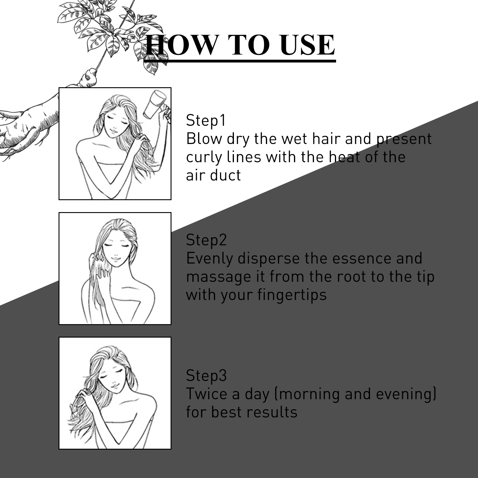 我们的护发精油含有矿油、霍霍巴籽油。它可以温和去屑控油,改善头皮环境和发质,滋养发根,减少脱发,促进头发生长,使头发更加浓密健康。它的使用方法很简单:先吹干湿发(用吹风机的热风使头发呈现卷曲的状态),再均匀抹开精油,用指尖从发根按摩至发尾即可。每日两次(早晚各一次),效果最佳。从根源上修复毛囊,强韧发根,减少头发脱落。
