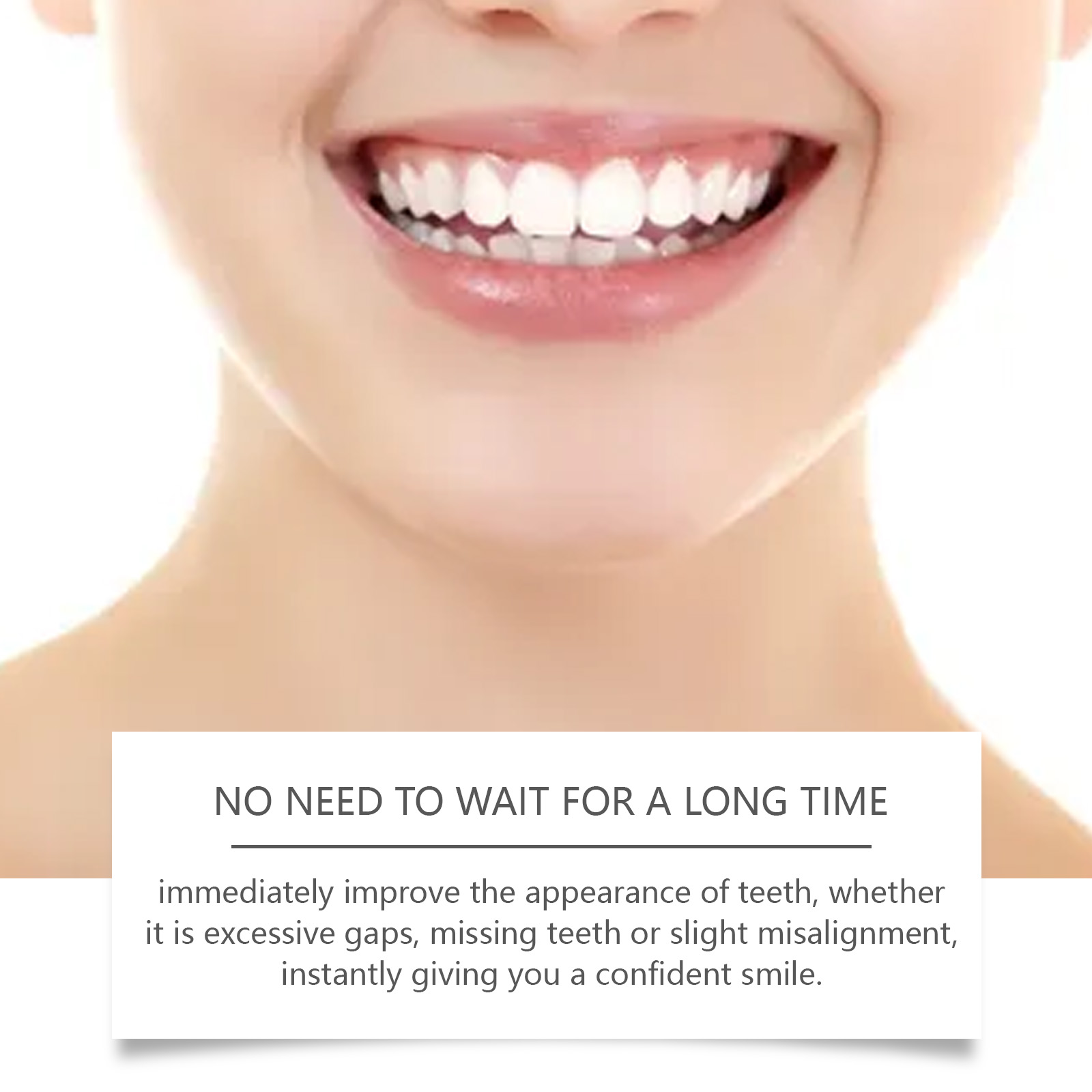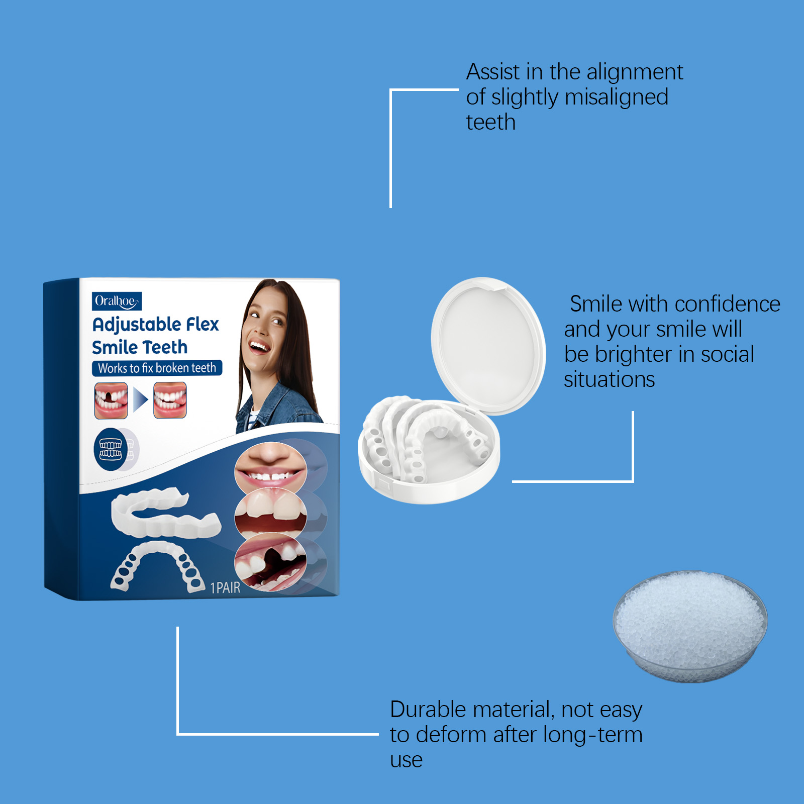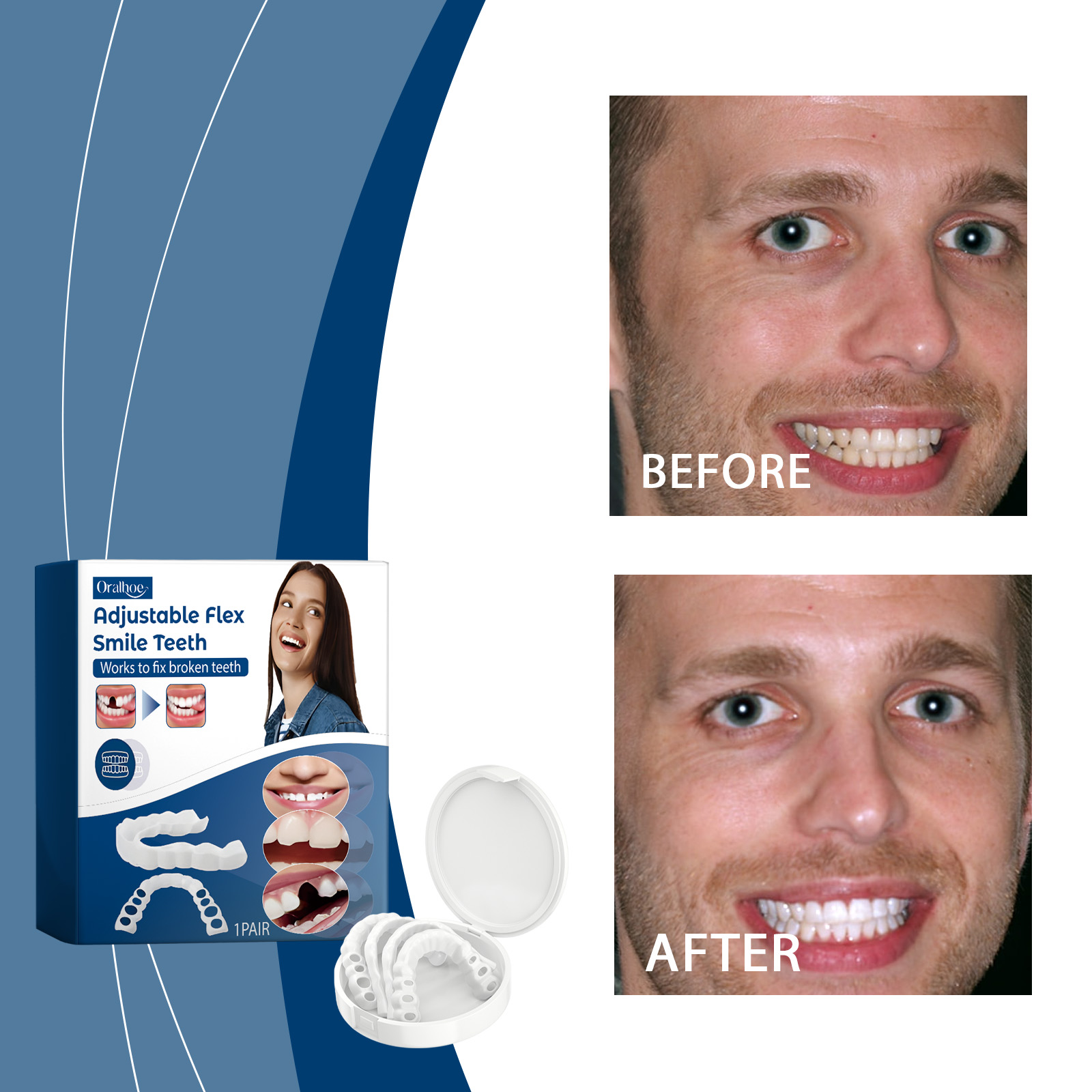 我们的可调节卡扣式假牙含有硅胶。它可以减少磨损并避免进一步损坏。它的使用方法很简单:先用温水软化假牙,使其更容易佩戴,将软化的假牙戴在嘴里,咬紧牙关,调整假牙的位置。并且可以立即改善牙齿外观,无论是间隙过大、缺牙还是轻微错位,瞬间给你一个自信的笑容。