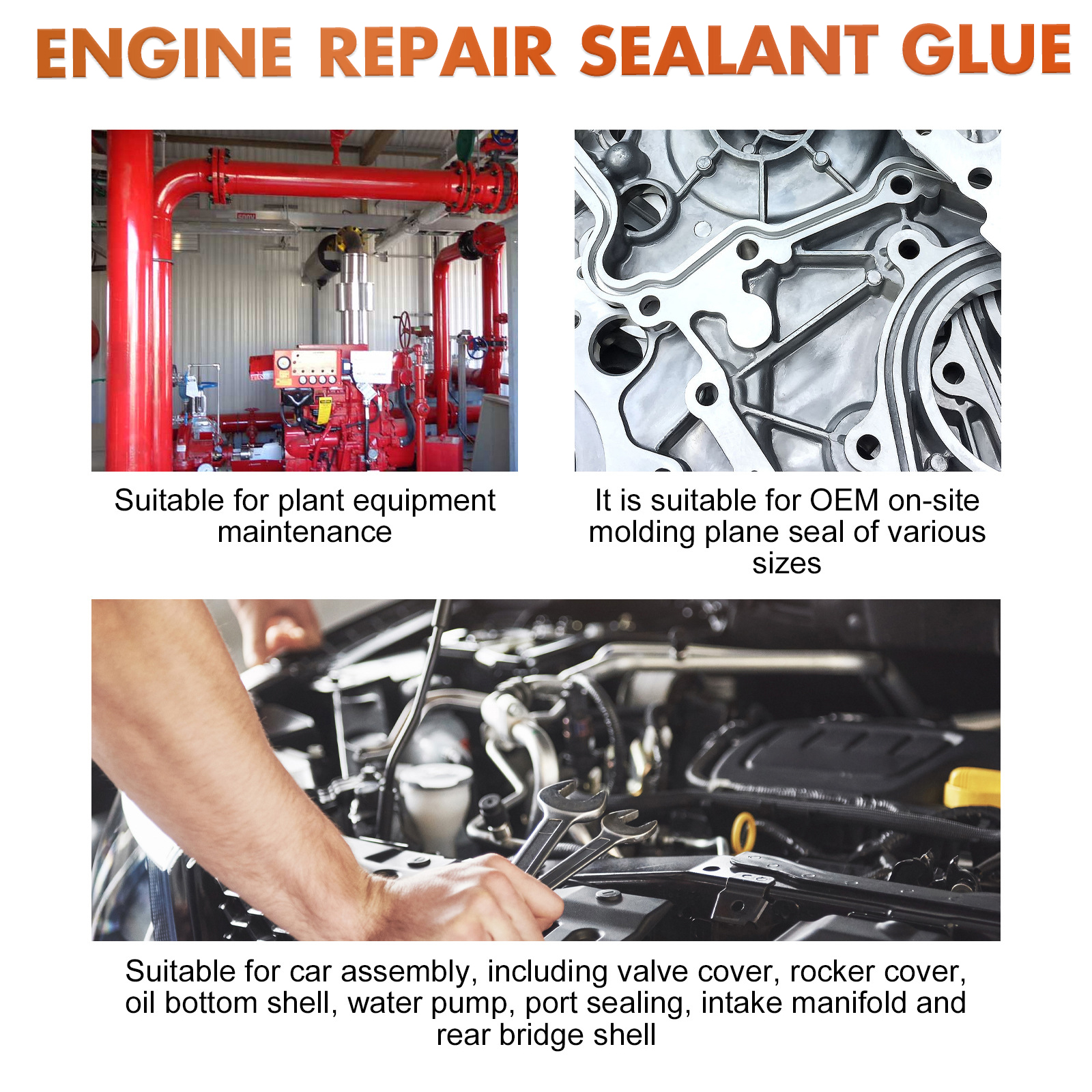 我们的发动机维修密封胶含有去离子水、表面活性剂、聚甲基丙烯酸甲酯。它可以具有良好的耐热性和柔韧性,适用于各种发动机维修。它的使用方法很简单:1. 清洁汽车发动机表面;2. 取适量密封胶涂在发动机上。3. 等待10分钟使表面干燥。成份健康绿色,无刺鼻气味,修复效果好。