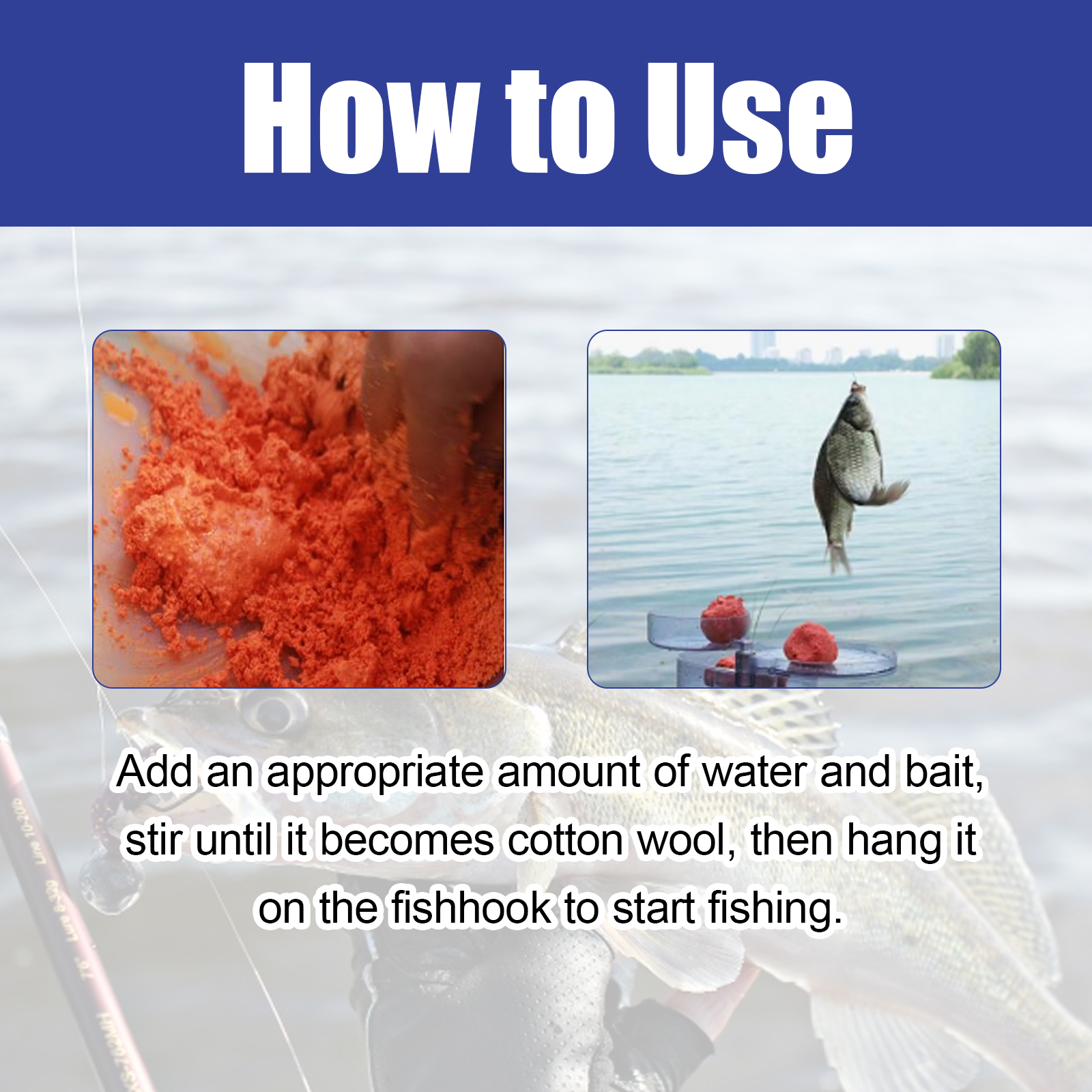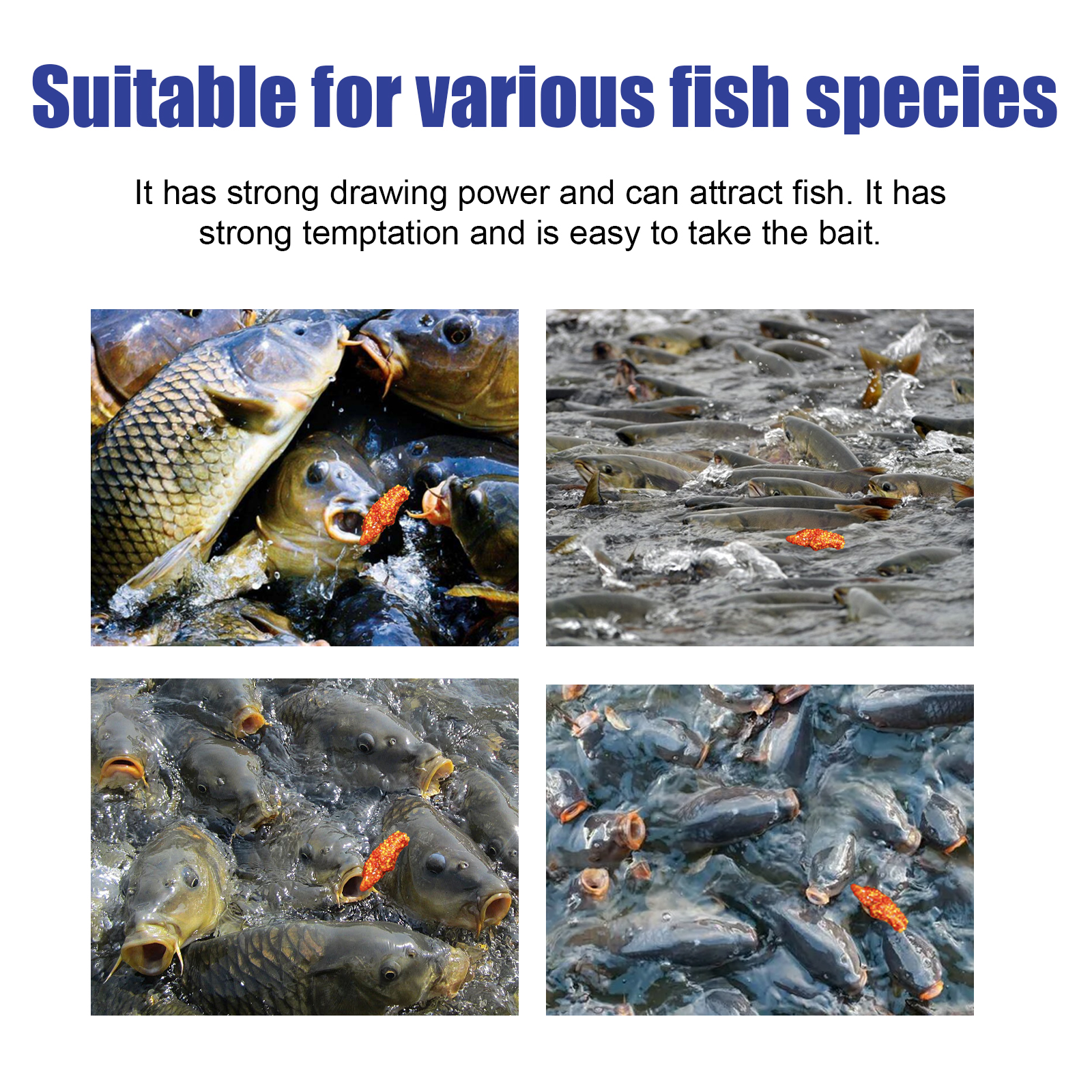 我们的诱饵剂含有天然植物蛋白纤维。它可以有很强的吸引力,可以吸引鱼。还具有很强的诱惑力,使鱼很容易上当受骗,增加鱼上钩的机会。它的使用方法很简单:加入适量的水和鱼饵,搅拌至变成棉絮,然后挂在鱼钩上开始钓鱼。我们的诱饵剂适用于水库/湖泊/河流/黑坑。它可以用于经验丰富的垂钓者或新手垂钓者,给他们一个愉快的钓鱼体验。