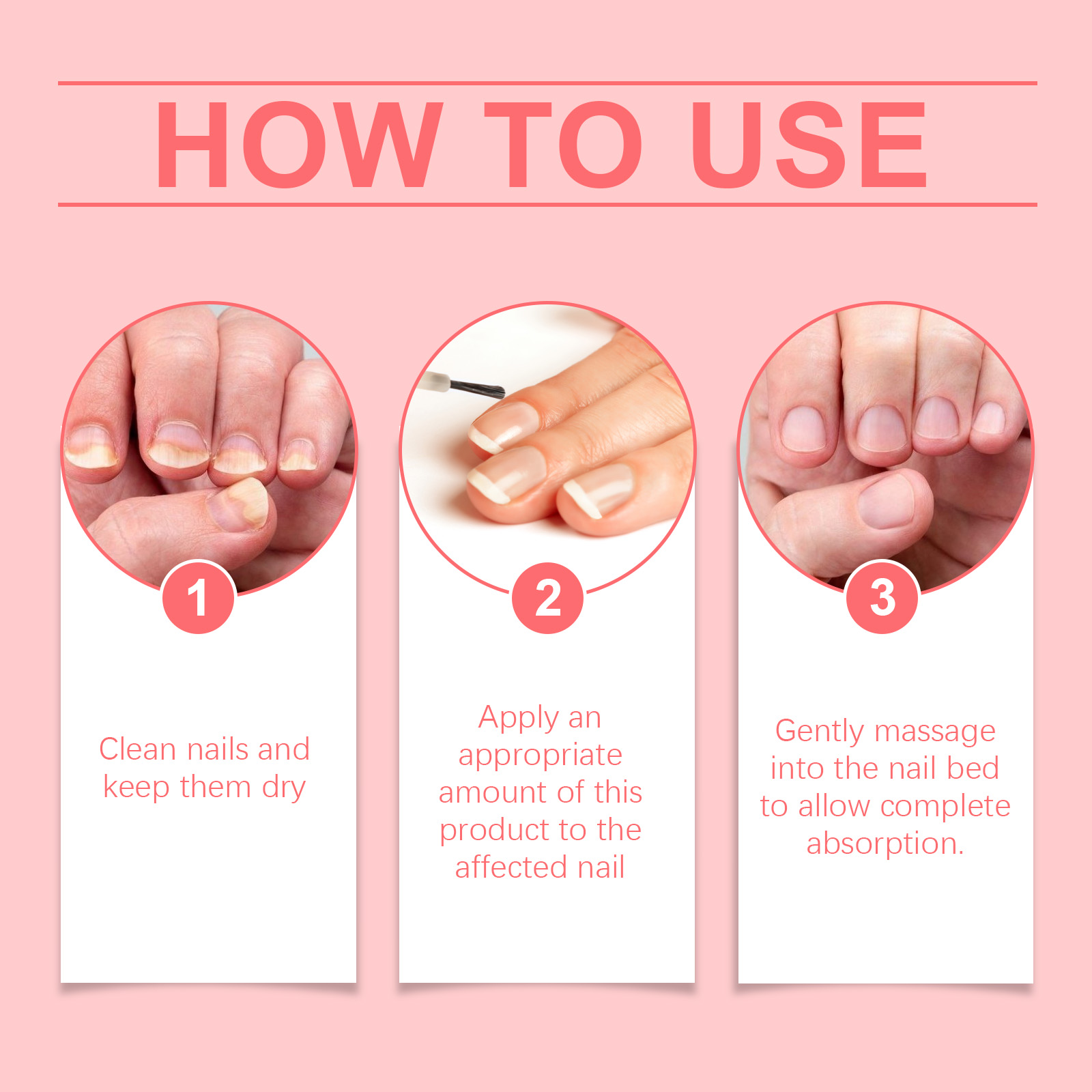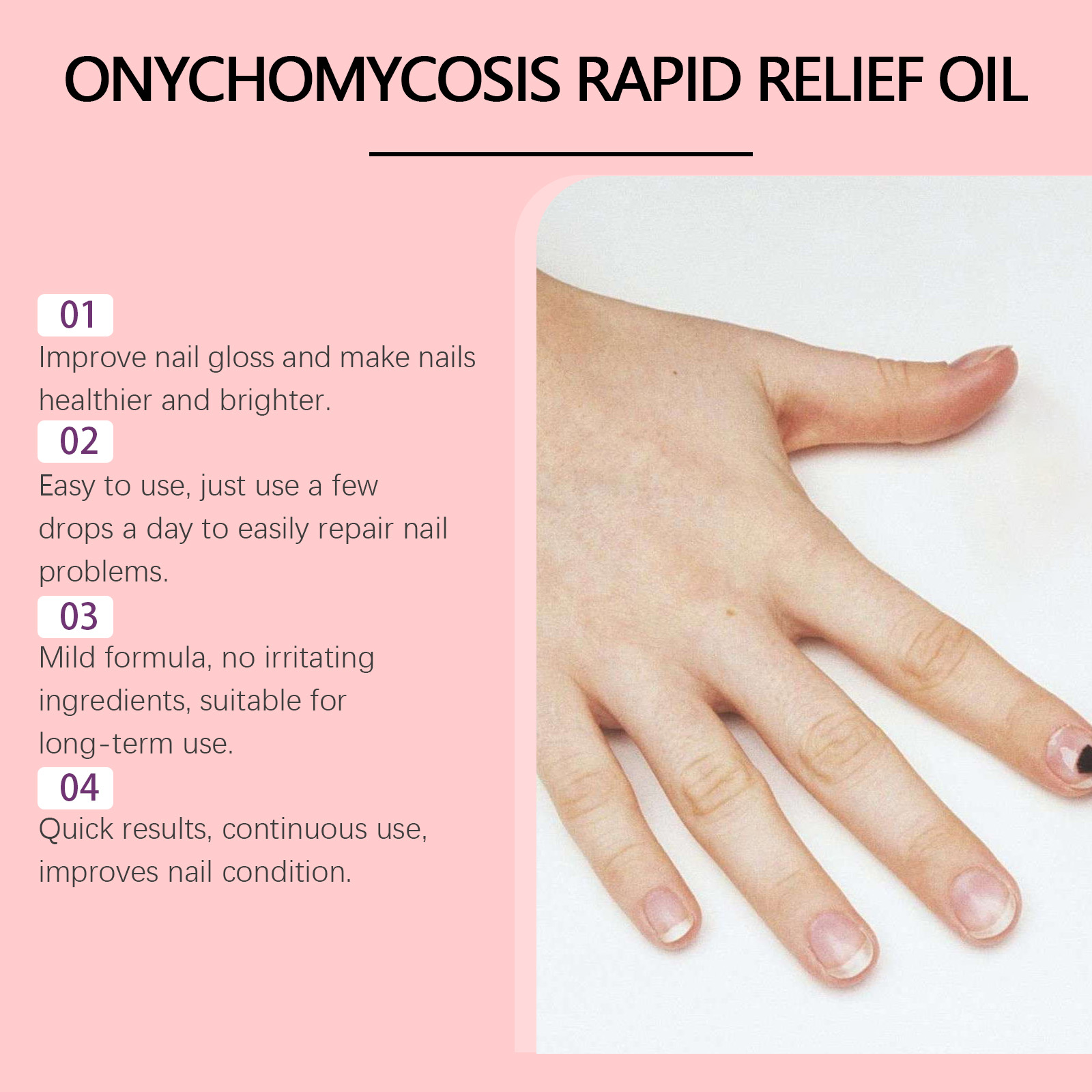 我们的灰指甲修护液含有茶树叶油、丁香花油、芦荟叶提取物。他可以有效修复受损指甲,保持指甲健康。滋养指甲,增强指甲韧性。提供抗氧化保护,保持指甲和皮肤健康。它的使用方法很简单:1.清洁指甲并保持干燥;2.取适量本品涂抹在受影响的指甲上;3.轻轻按摩至甲床,使其完全吸收。灰指甲修护液帮助修复受损的指甲,恢复健康的光泽。提供丰富的营养,滋养指甲及周围肌肤,增强指甲韧性。