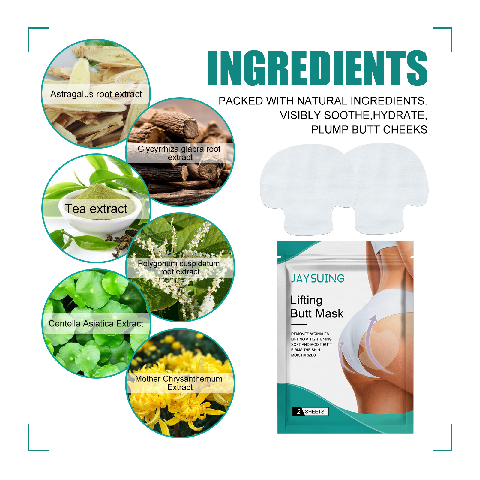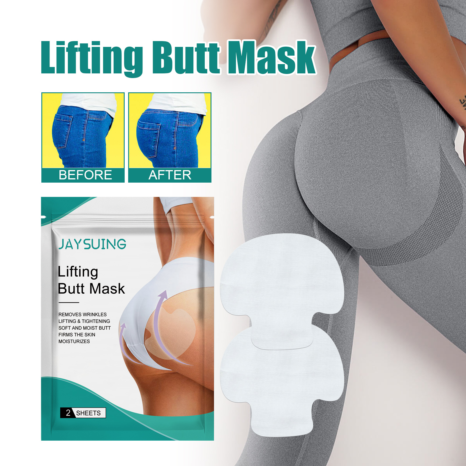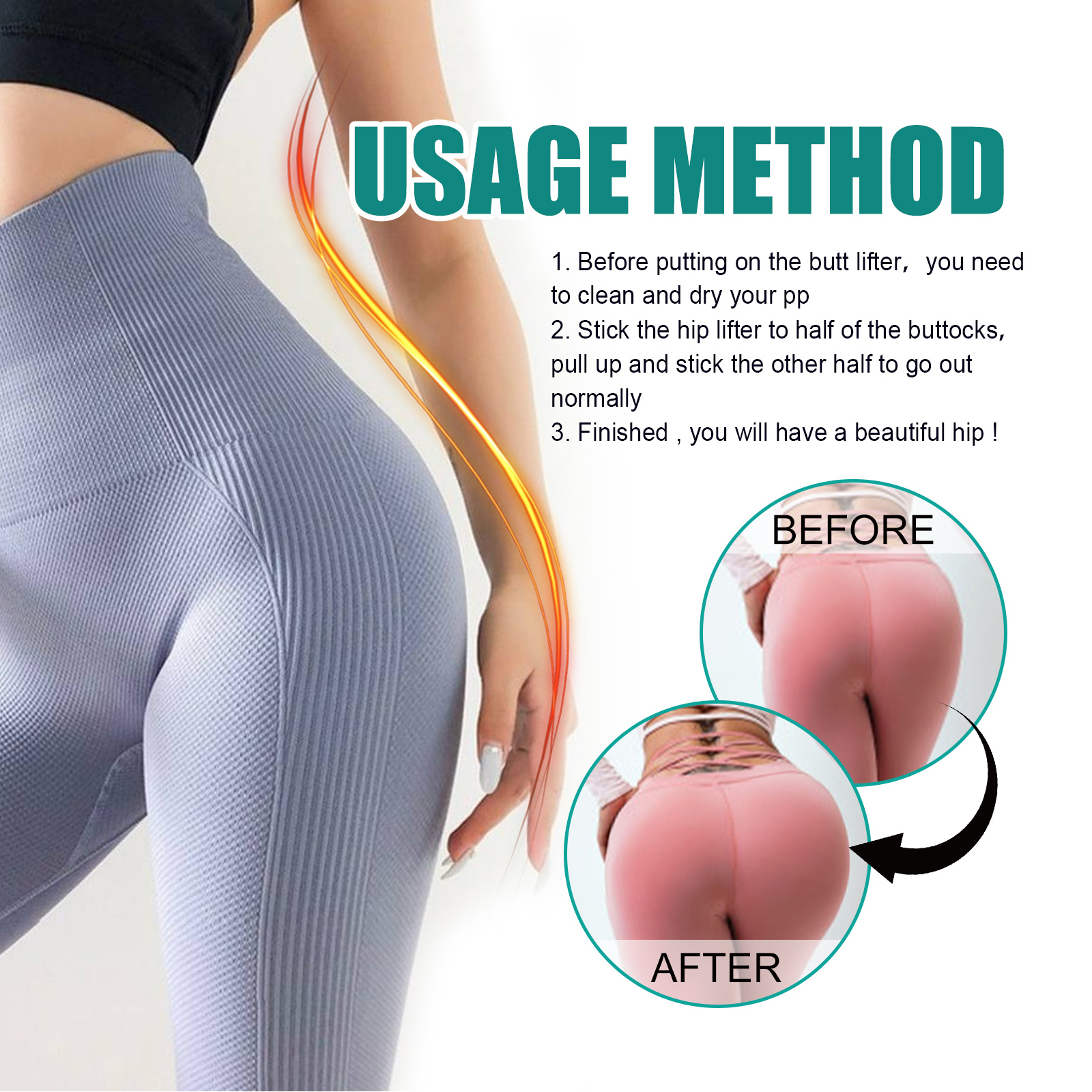 我们的臀部提拉贴含有黄芪提取物、甘草提取物、茶提取物。它可以减少皱纹、脂肪团和瑕疵,给予一个完美光滑外观;舒缓臀部肌肤,减少痤疮,使臀部肌肤更光滑,更有光泽。它的使用方法很简单:在使用臀部升降器之前,您需要清洁并干燥臀部,将提臀器贴在一半臀部,向上拉,贴另一半臀部,正常出门,完成后,你将拥有一个美丽的臀部。臀部提拉贴明显舒缓,滋润,丰满臀部,加速臀部脂肪代谢,减少臀部下垂或浮肿,使臀部紧致饱满。