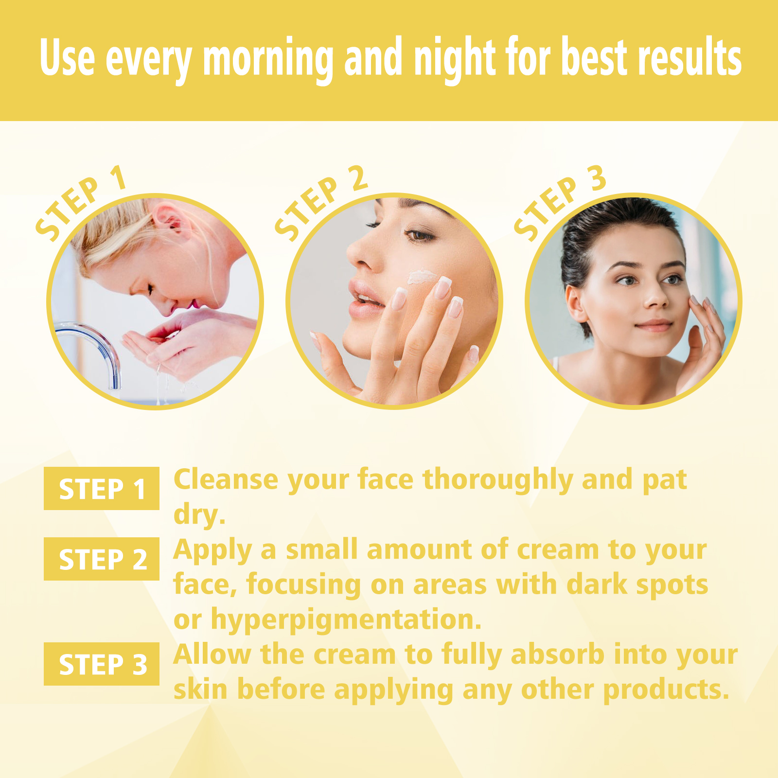 我们的暗斑矫正霜含有视黄醇,芦荟提取物,维生素C。它可以淡化已有黑斑,防止新黑斑产生。控制肤色,恢复肌肤光泽,使肌肤更亮、饱满、有活力。它的使用方法很简单:彻底清洁面部,拍干;在脸上涂少量面霜,集中在有黑斑或色素沉着的地方;在使用任何其他产品之前,让面霜完全被皮肤吸收。滋养及修复肌肤,防止色素沉着和老年斑,减少黑斑的出现,提亮肤色,均匀肤色,温和提亮及去除暗斑,令肌肤焕发光彩,修复损伤的皮肤。