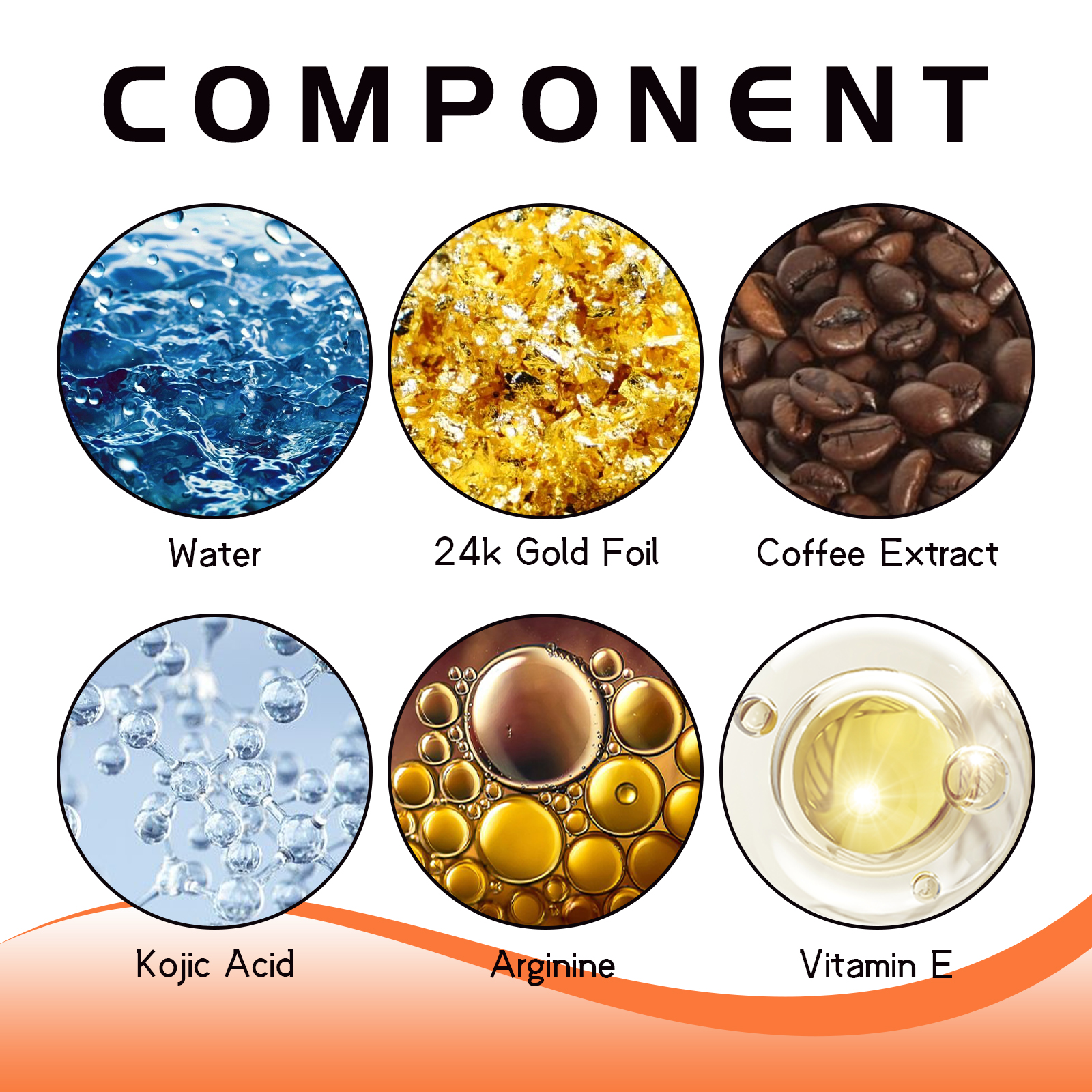 我们的24K金肽逆转精华液含有24k金箔、咖啡提取物、精氨酸。它可以减少细纹和皱纹的出现,减少浮肿和黑眼圈,丰满和光滑皮肤,提亮和紧致,修复和滋润皮肤。它的使用方法很简单:洁肤后,取适量精华液均匀涂抹于面部及颈部,用手打圈轻轻按摩,使其吸收。加速肌肤营养吸收,促进微循环,使肌肤回弹焕发活力。