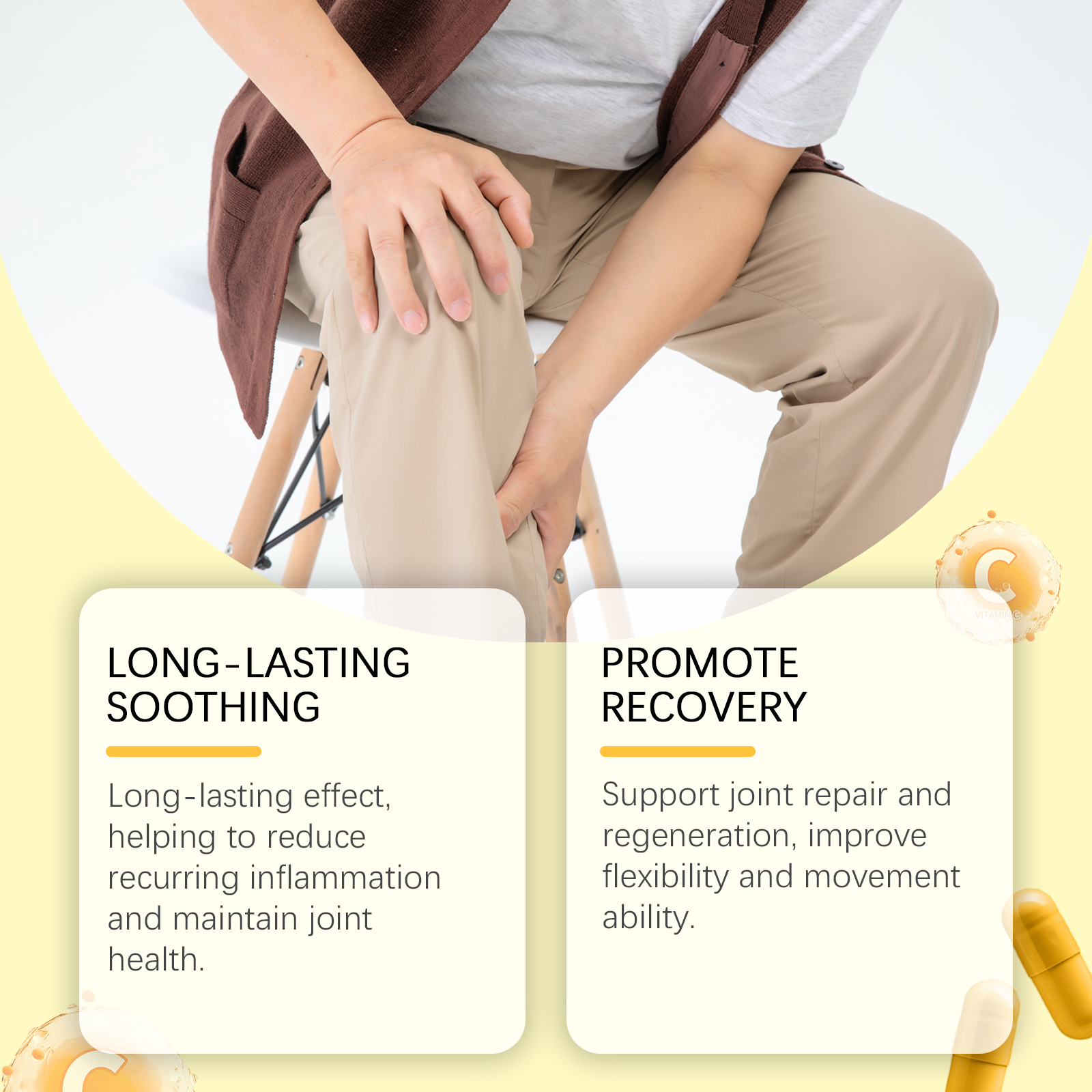 我们的关节炎疼痛缓解胶囊含有维生素C、钠。它可以抗炎作用持久,有效减轻肿胀。它的使用方法很简单:每日2次,每次1~2粒。并且可以促进关节健康,增强活动能力。