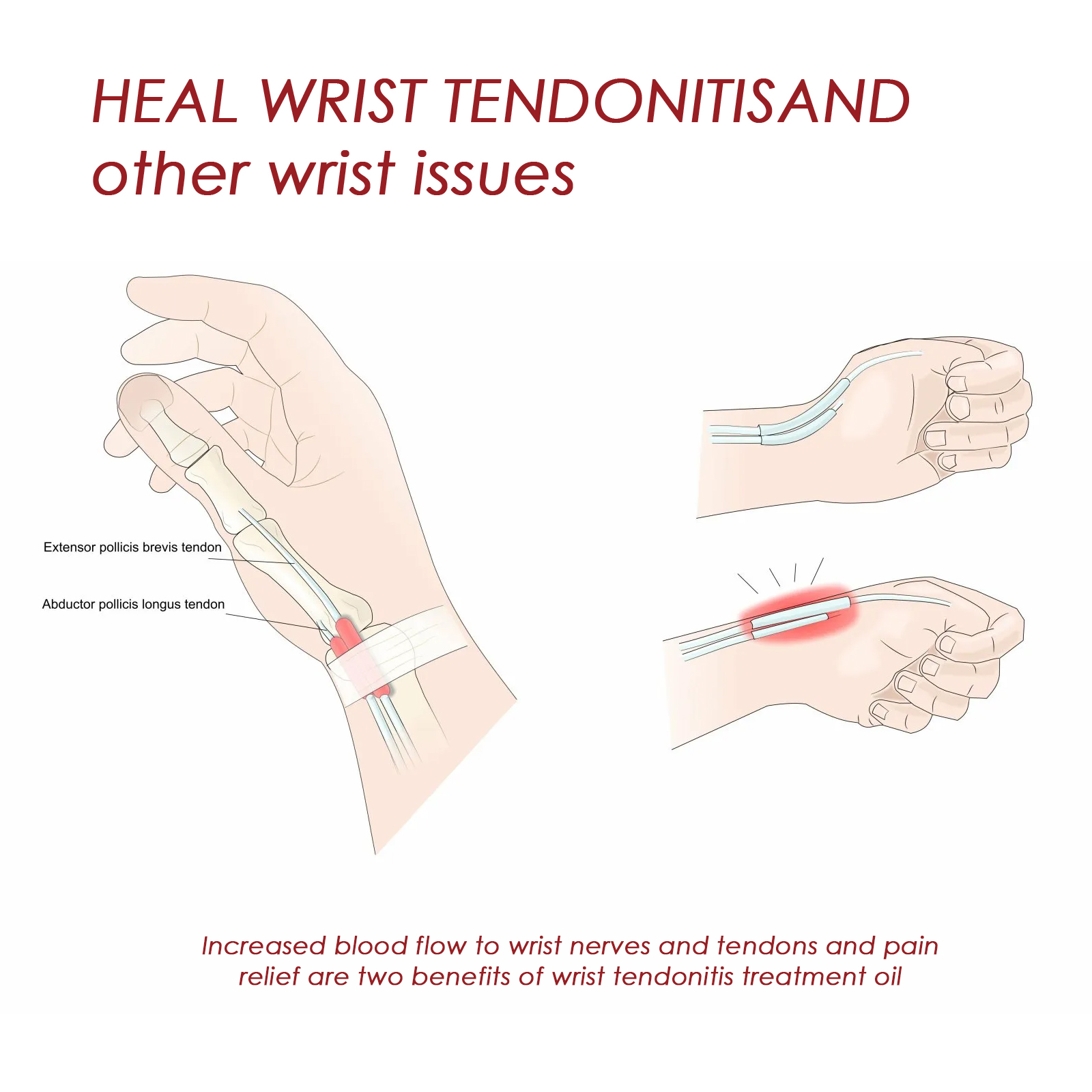 我们的手腕关节修护油含有薄荷油,山金车,桉树油。它可以减少肿胀炎症,增加手腕神经和肌腱的血流量,缓解疼痛,有效治疗手腕肌腱炎。它的使用方法很简单:涂油前先清洁并擦干脚,洁面后,在目标部位涂上大量的油,按摩至吸收,经常使用会有惊人的效果。缓解手腕关节酸痛,缓解肌腱炎,消除肿胀和疼痛。