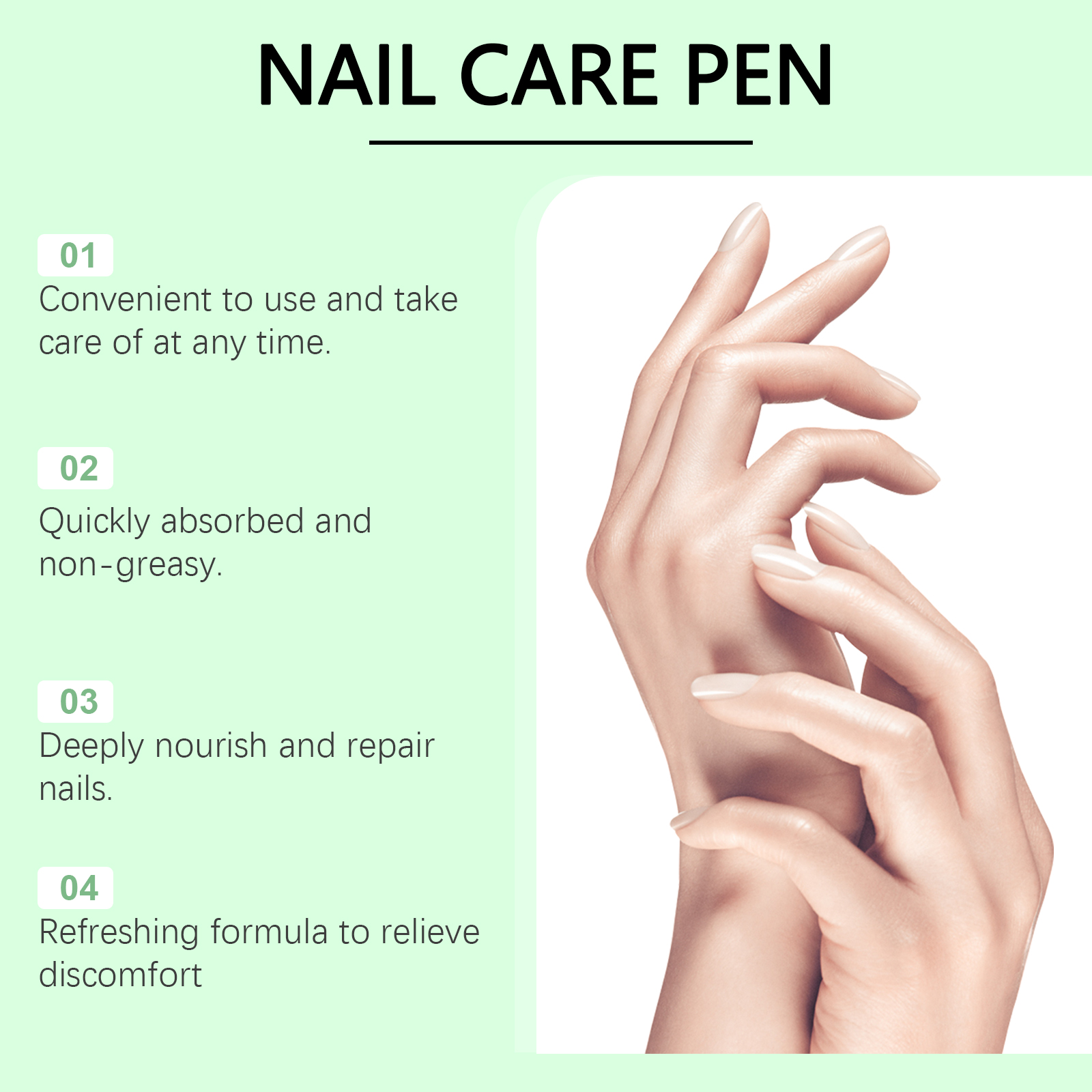 我们的指甲护理液含有荷荷巴籽油、椰子油。它可以有效缓解不适,适合日常护理。强化指甲结构,提高指甲韧性,减少指甲破损。它的使用方法很简单:清洁指甲并保持干燥,取适量本品均匀涂于患处,轻轻按摩至完全吸收。并且可以快速吸收,不油腻。