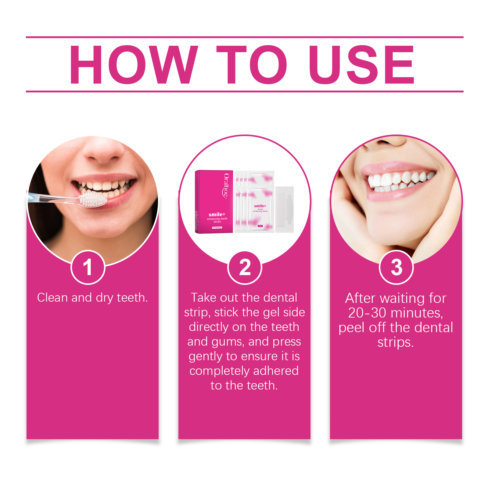我们的牙齿亮白美牙贴含有PO膜、凝胶。它可以时刻保持牙齿洁白,让你的笑容自信地面对每一个关键时刻。快速分解顽固的牙渍。不破坏牙釉质,温和美白,无刺激。它的使用方法很简单:1.清洁和干燥牙齿。2.取出牙条,将凝胶面直接贴在牙齿和牙龈上,用力确保完全粘在牙齿上。3.等待20-30分钟后,撕下牙贴。牙齿亮白美牙贴适合各种牙齿敏感人群使用。不需要复杂的工具,家用级美白解决方案。