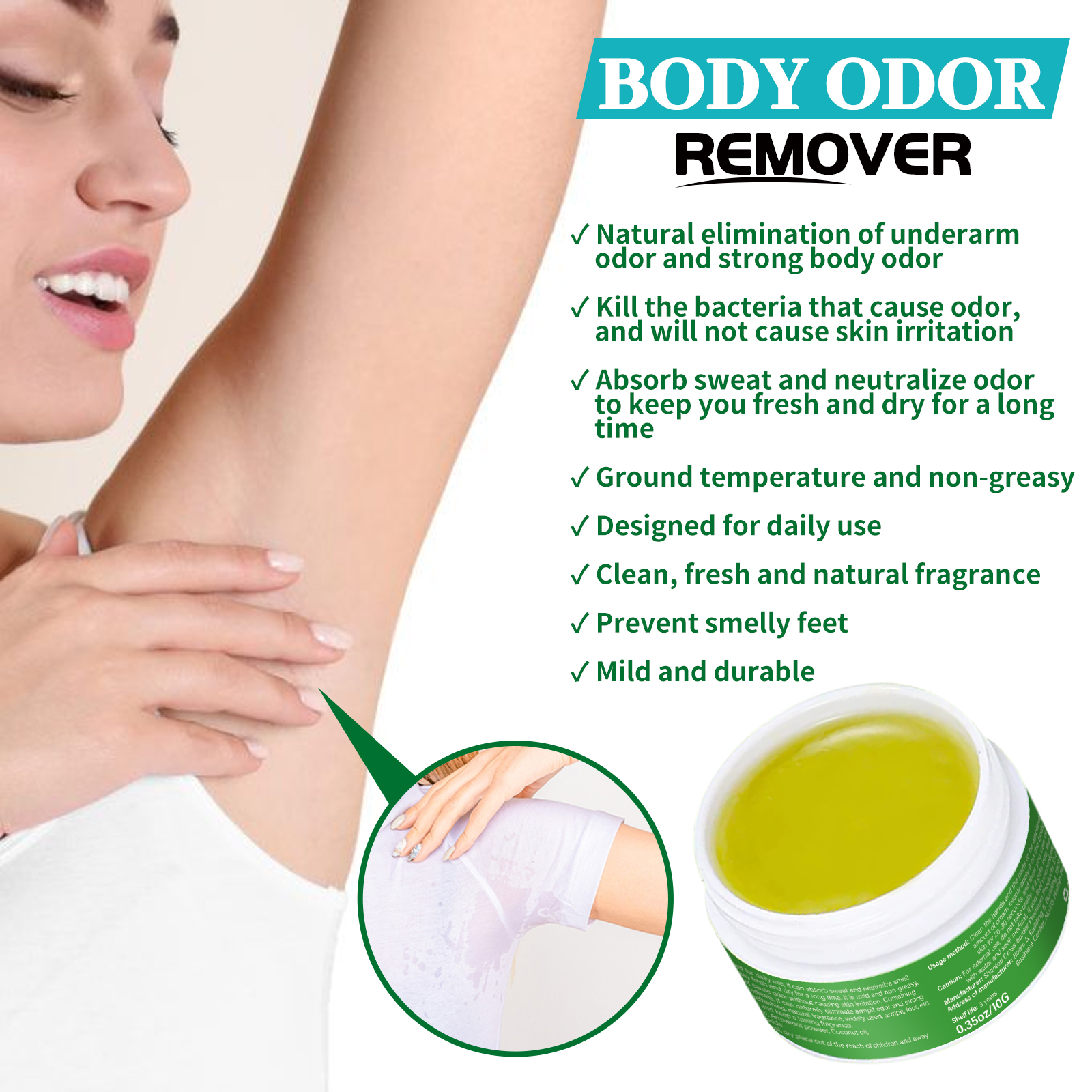 我们的腋臭膏含有乳木果油、椰子油、氢氧化镁。它可以去除难闻气味,提供持久的保护,滋养和保持皮肤柔软,驱除异味渗透深入,保持皮肤持续干净,远离体臭。它的使用方法很简单:首先清洁双手和待涂抹部位,取适量面霜均匀涂抹在身体部位,轻轻按摩20-30秒,然后等待其吸收即可,使用后深入皮肤深层,温和去除异味,破坏异味分子,恢复正常气味,缓解过度出汗,使身体保持清爽。