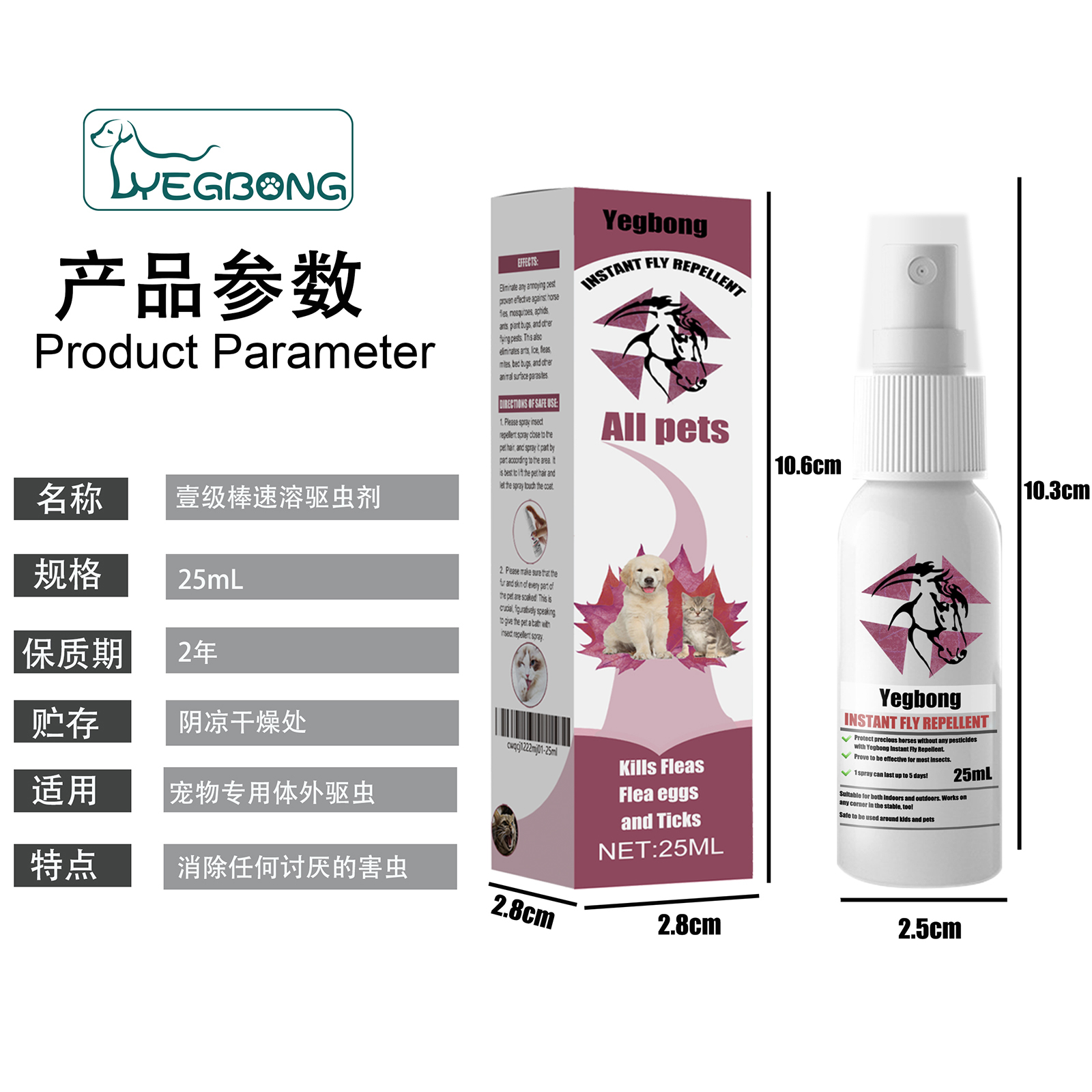 我们的宠物驱虫喷雾含有氯菊酯 、四氯菊酯。它可以消灭任何讨厌的害虫,被证明对马蝇、蚊子、蚜虫、蚂蚁、植物臭虫和其他飞行害虫有效。这也可以消除蚂蚁、虱子、跳蚤、螨虫、臭虫和其他动物表面的寄生虫。它的使用方法很简单:请将驱虫喷雾喷在宠物毛发附近,并根据区域分部位喷洒。最好抬起宠物的毛发,使喷雾接触到毛皮。请确保宠物身体各部位的毛发和皮肤都已浸湿!这至关重要,比喻来说,就是用驱虫喷雾给宠物洗澡。对人类和动物都安全,儿童和宠物周围使用安全。