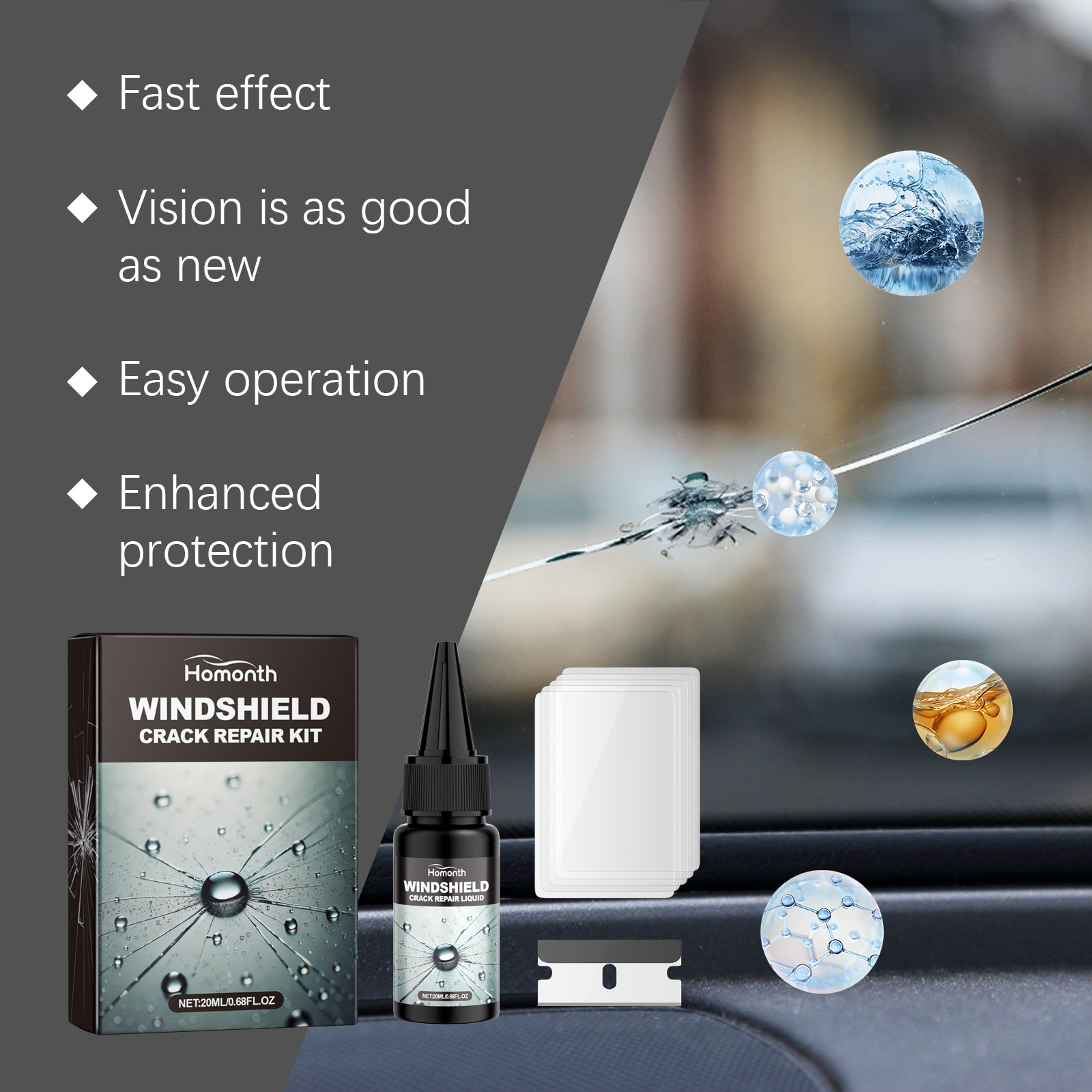 Homonth Windshield Crack Repair Kit, Car Front Windshield Nano Repair Solution Package Quickly Repair Cracks Clear Vision Safe Travel