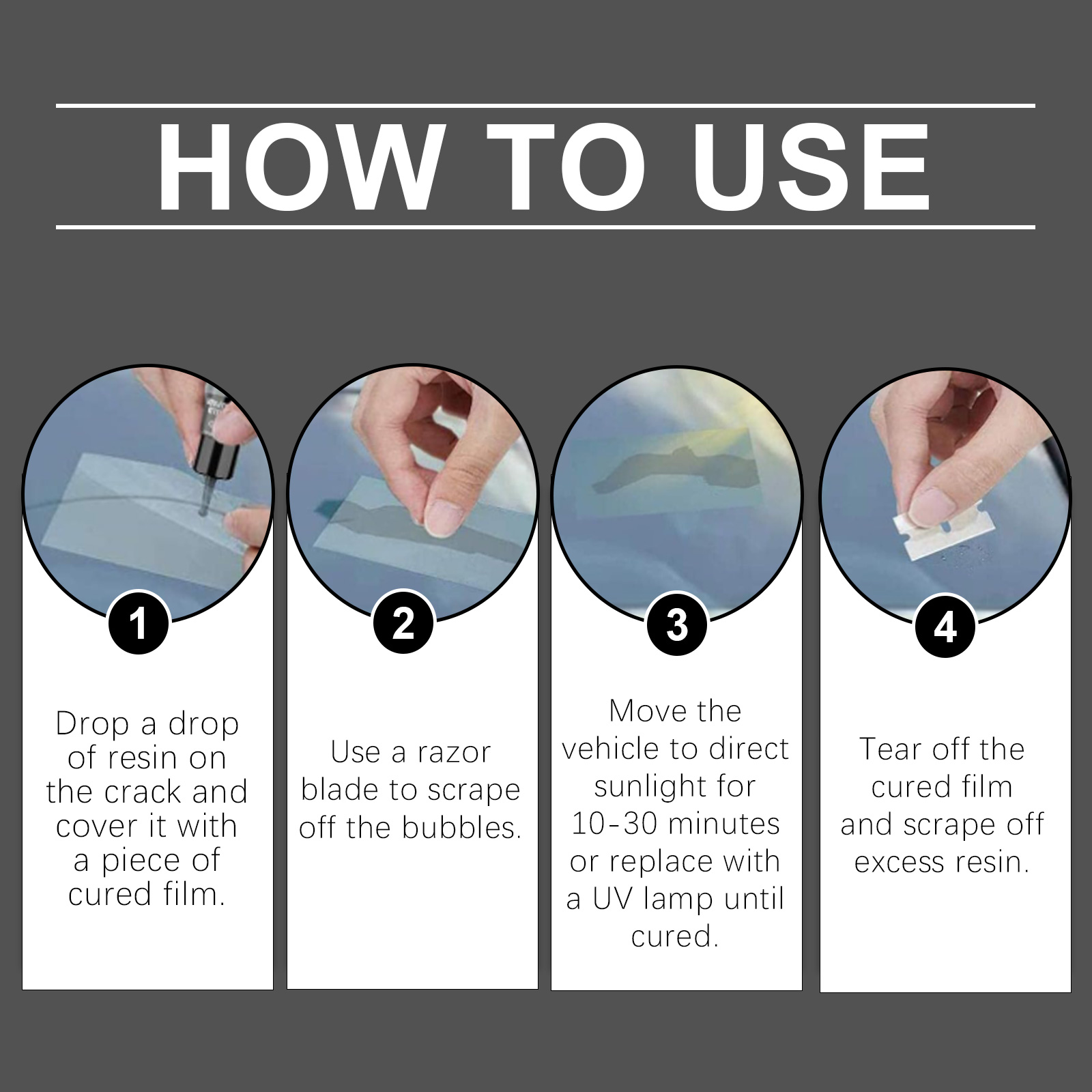我们的挡风玻璃裂纹修理套件含有纳米氧化钛、矿物油、表面活性剂。它可以快速修复裂缝,效果持久不易脱落,提高玻璃的透明度,还原新的视觉效果,并增强玻璃强度,有效抵御外界冲击。它的使用方法很简单:滴一滴树脂在裂缝上,用一片固化的薄膜覆盖,用刀片刮掉气泡,将车辆移至阳光直射处10-30分钟或更换紫外线灯直至固化,最后撕掉固化膜,刮掉多余的树脂即可。可以使修复后的表面光滑无划痕。防止裂缝的蔓延,延长玻璃的使用寿命。