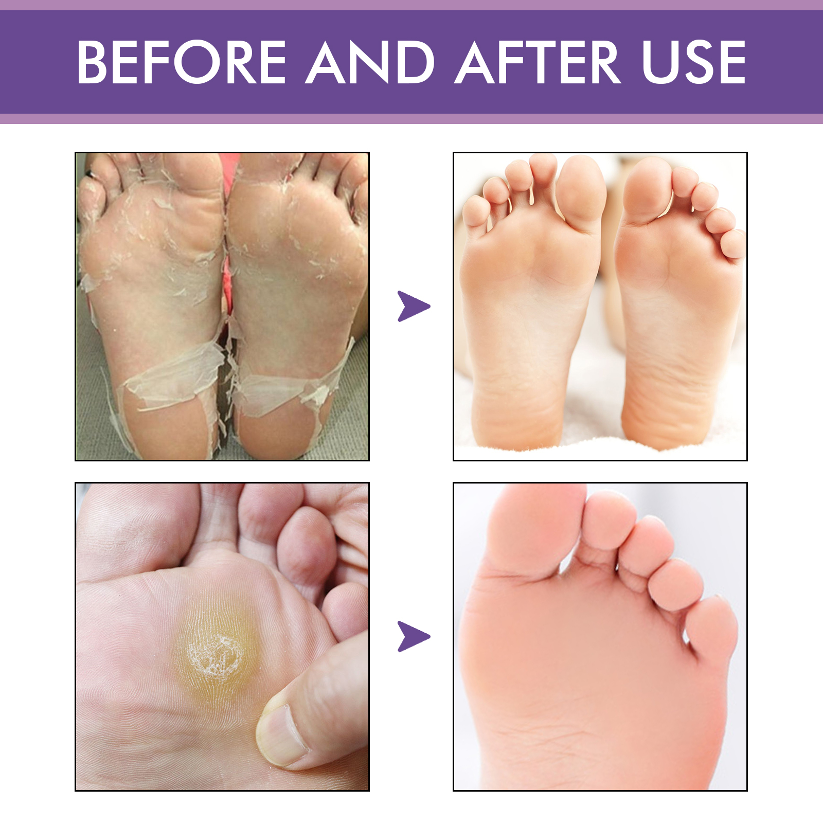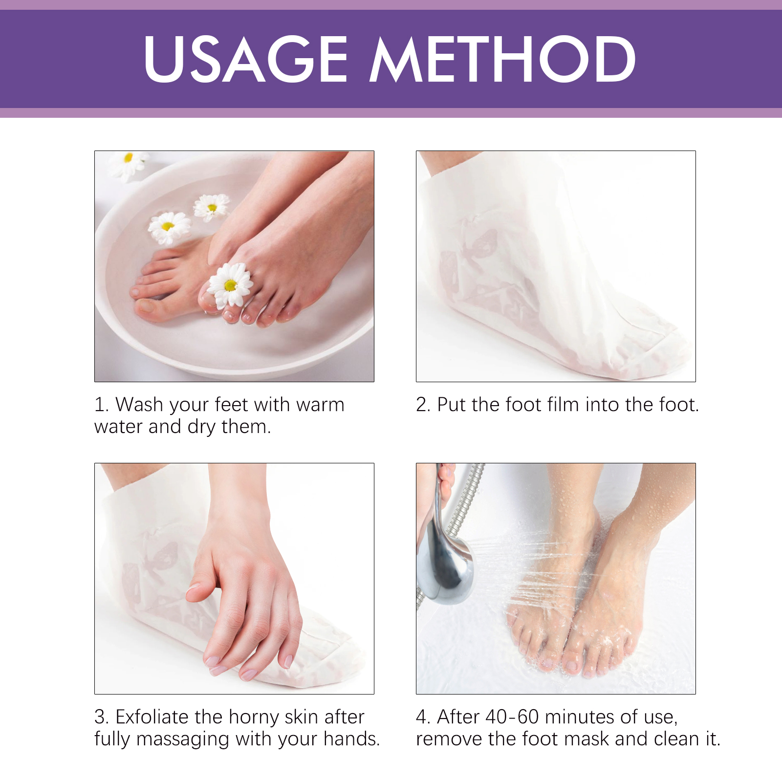 我们的薰衣草足膜含有薰衣草油、乳木果油、茶树油。它可以修复损伤皮肤,有效止痒,滋养足部肌肤,去除死皮细胞,让你的双脚柔软光滑。它的使用方法很简单:用温水洗脚后擦干,打开产品包装穿上足膜,用手按摩去除角质,40-60分钟后,取下足部面膜并清洗干净即可。滋养保湿足部肌肤,防止干裂,有效去除死皮。