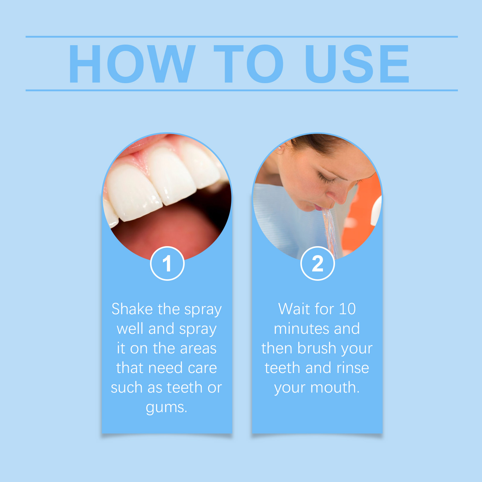我们的牙齿护理喷剂含有羟基磷灰石、可可碱、胶体银。它可以修复牙釉质,强健牙齿。降低敏感度,提高舒适度。抗菌保护,保持清洁。它的使用方法很简单:1.摇匀喷雾剂,喷洒在需要护理的部位,如牙齿或牙龈。2.等待10分钟,然后刷牙和漱口。多种成分协同作用,全面保护牙齿健康。无刺激性配方,适合日常使用,安全可靠。