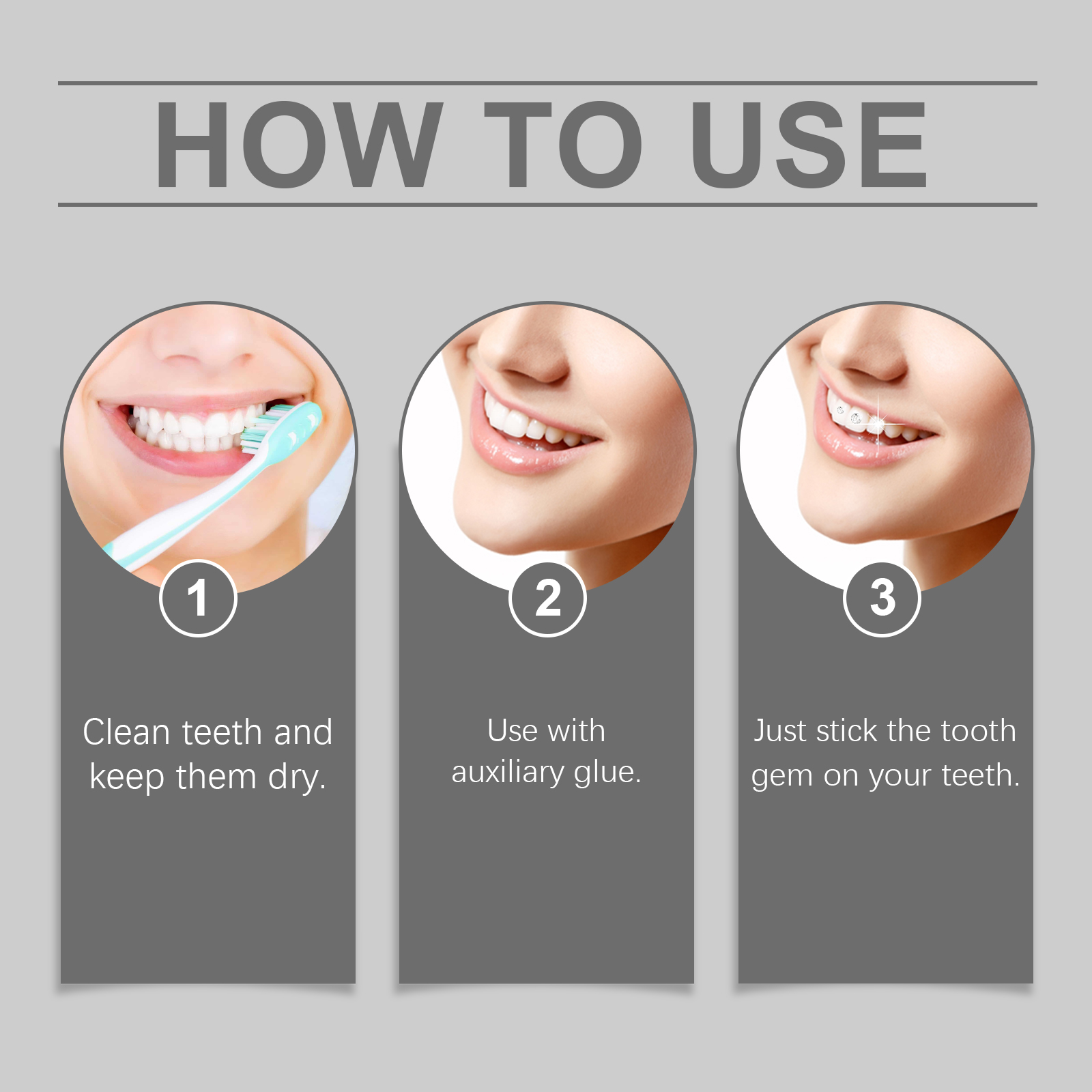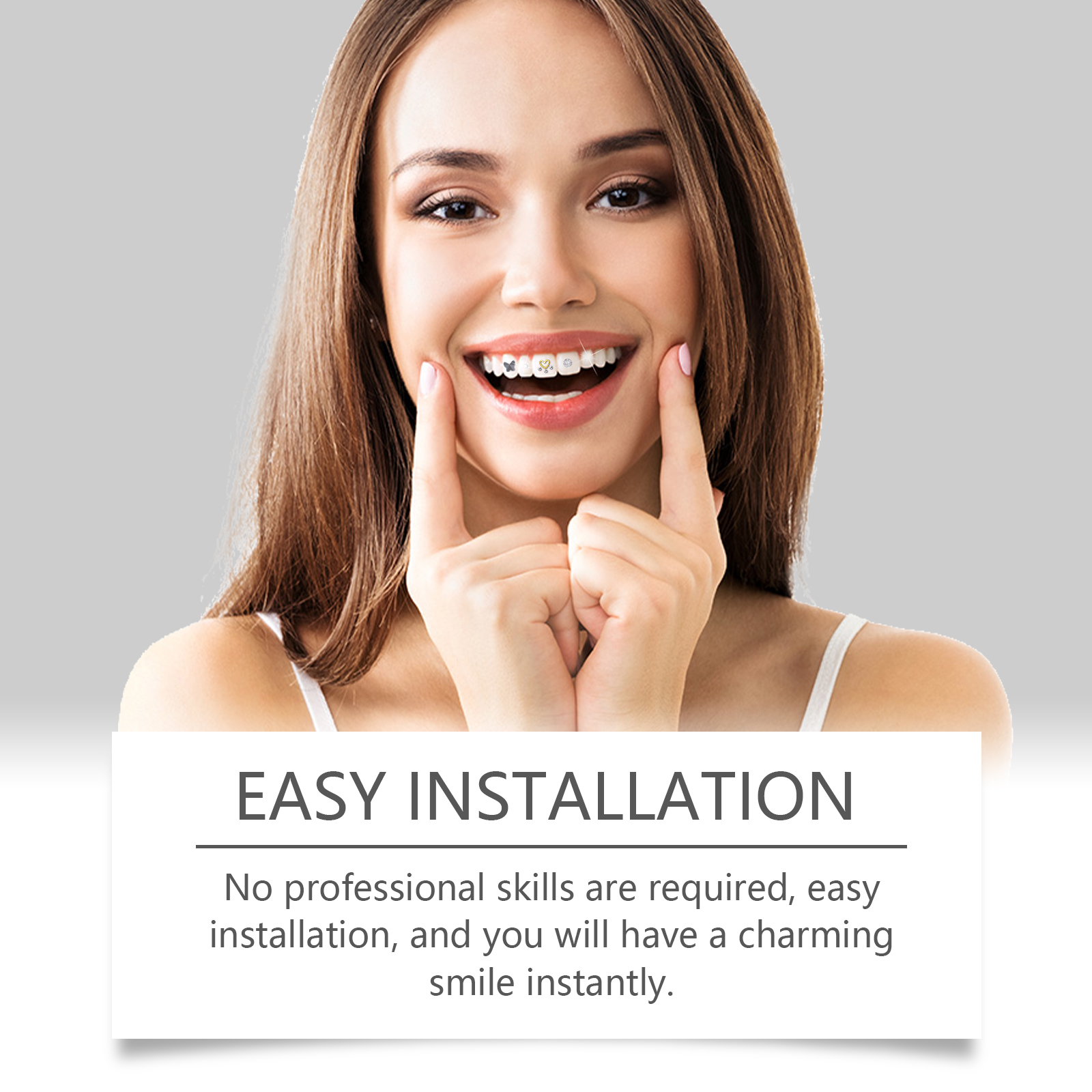 我们的水晶牙钻含有水晶。它可以让你成为时尚的焦点,展现你独特的个性。它的使用方法很简单:清洁牙齿,保持牙齿干燥,配合辅助胶使用。把牙宝石贴在牙齿上就可以了。并且安装简单,瞬间就能拥有迷人的微笑。