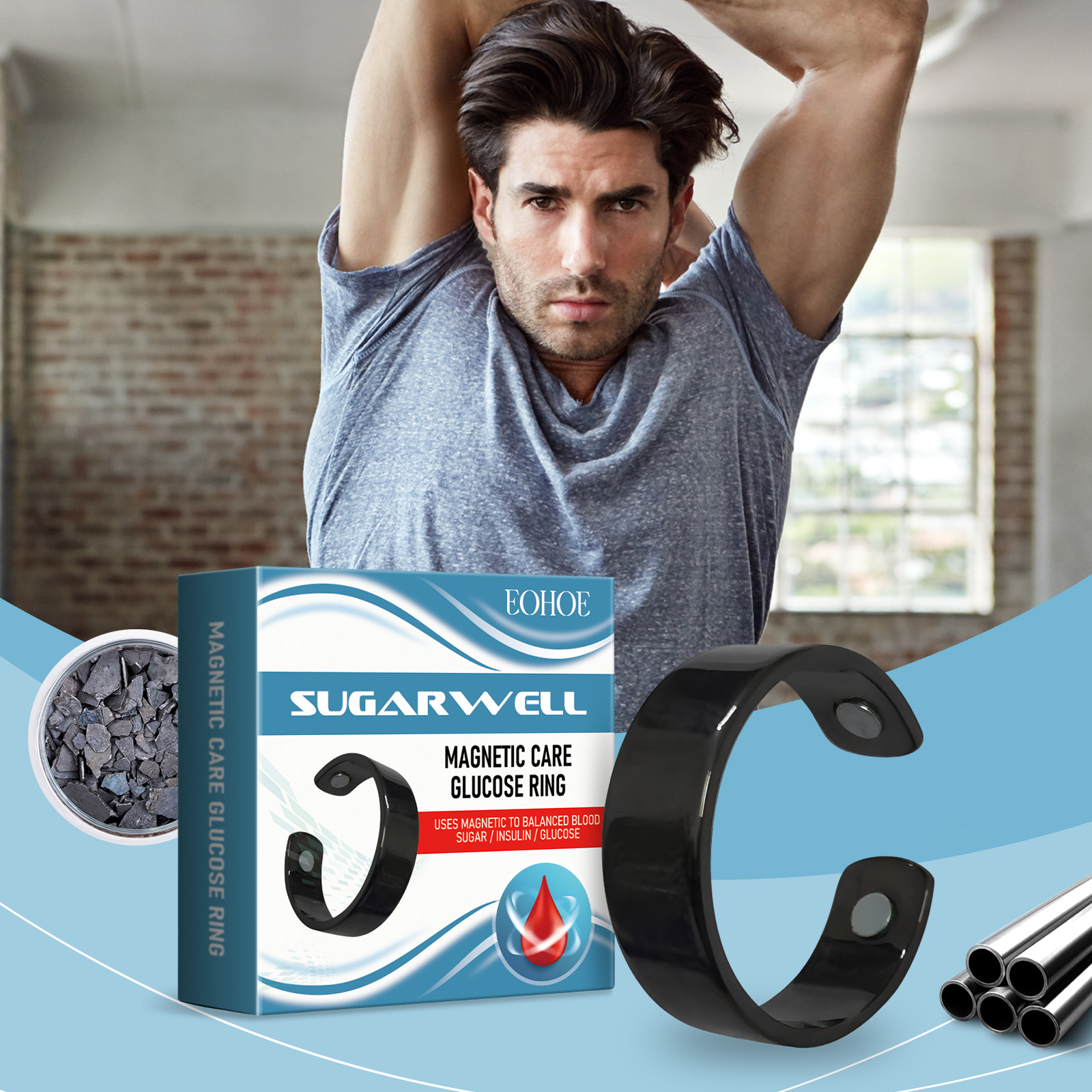 我们的身体护理戒指含有合金、磁石。它可以它可以通过磁性方法促进细胞代谢,帮助提高胰岛素敏感性。能改善整体血液循环和心脏健康。它的使用方法很简单:直接戴在手指上,根据手指的舒适度轻轻按压。身体护理戒指能够平衡体内的血糖、胰岛素和葡萄糖,使你更健康。