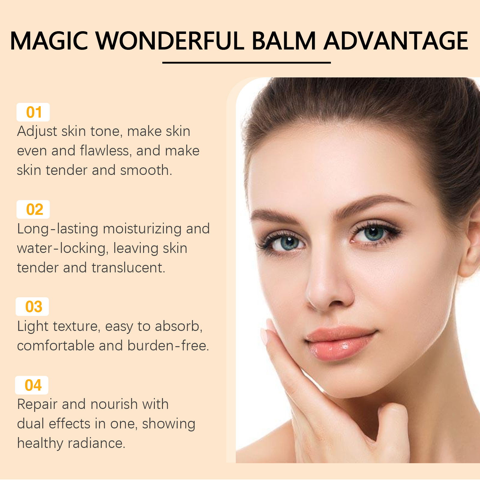我们的亮肤BB日霜含有甘油、透明质酸、烟酰胺。它可以增强肌肤弹性,深层滋养,使肌肤水润饱满。淡化细纹,均匀肤色,使肌肤更亮,更有光泽。抗氧化,延缓皮肤老化,保持皮肤健康。它的使用方法很简单:1. 清洁和干燥面部皮肤;2. 取适量本品均匀涂于面部;3. 粉底和化妆品可以结合使用,还是可以单独使用。轻松创造半透明的肤色,让你的皮肤容光焕发。双重保湿,让肌肤整天保持水润。