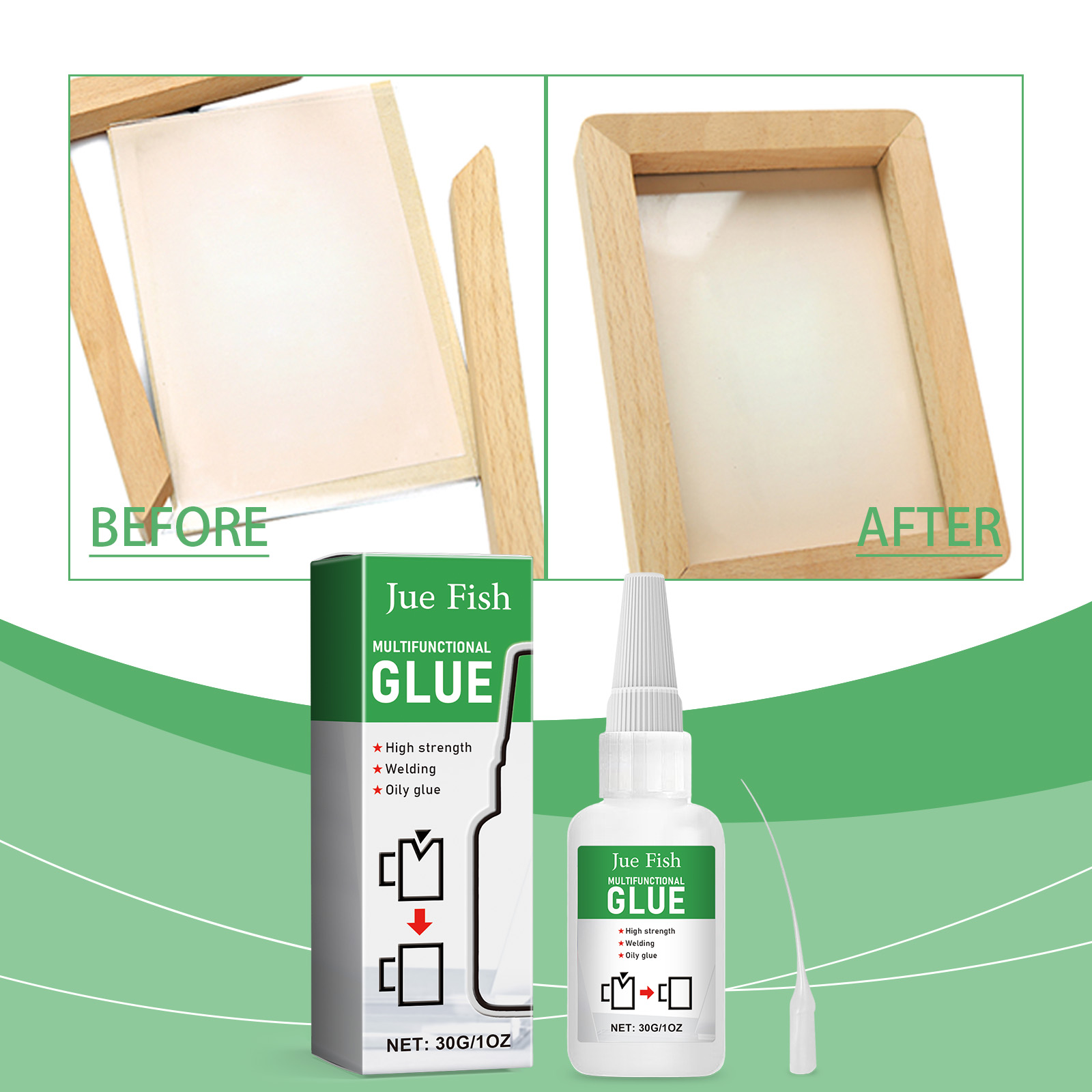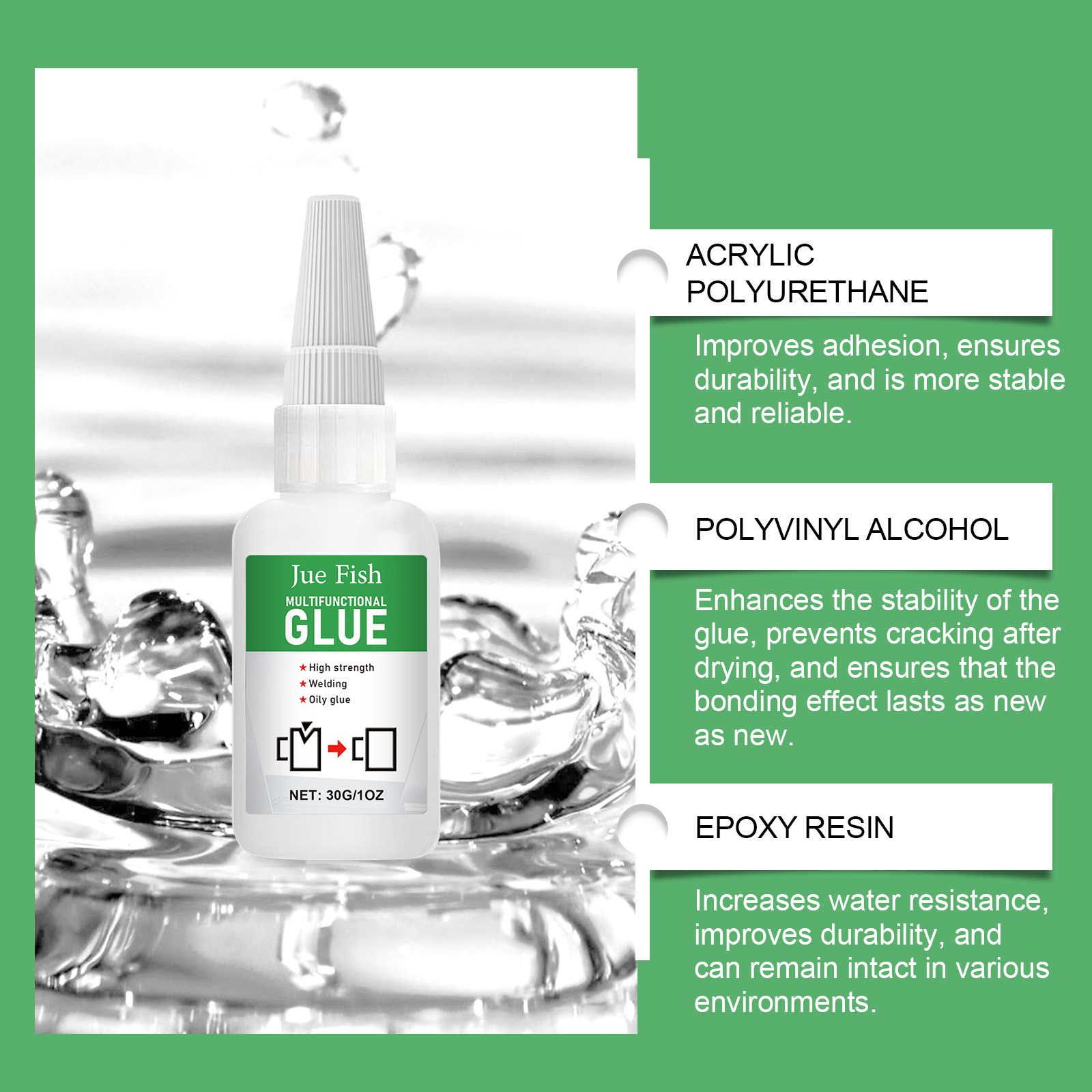 我们的多功能胶水含有环氧树脂和醋酸乙烯。它可以有效地粘合物体而不留下明显的痕迹,使修复或拼接区域看起来完美无瑕。其使用方法非常简单:清洁待粘接表面,用滴管将本品适量均匀涂抹在待粘接表面,固定30秒左右,待完全干燥即可。且附着力强,能形成永久粘结,耐水性强,不易脱落。
