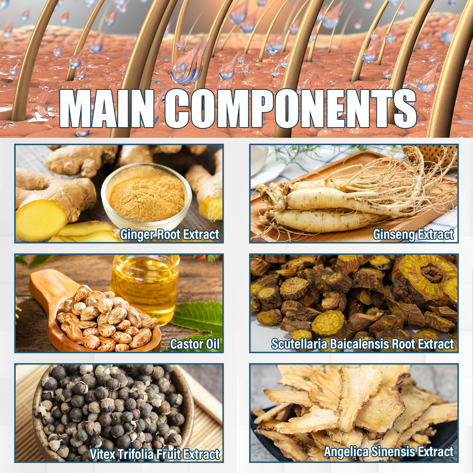 我们的护发精华喷雾含有生姜根提取物、人参提取物、当归提取物。它可以改善头发健康,修复受损头发,深度滋养发根,减少头发脱落,使头发柔顺有光泽。它的使用方法很简单:首先清洁和吹干头发后,确保头发干燥,之后取出本品,喷在脱发部位,均匀涂抹,轻轻按摩至吸收即可。使用后要洗手,每天使用两次,使用后有助于滋润头皮,改善粗糙,深层修复,保持水分清除积聚,平衡油性头皮,唤醒头发的新活力。