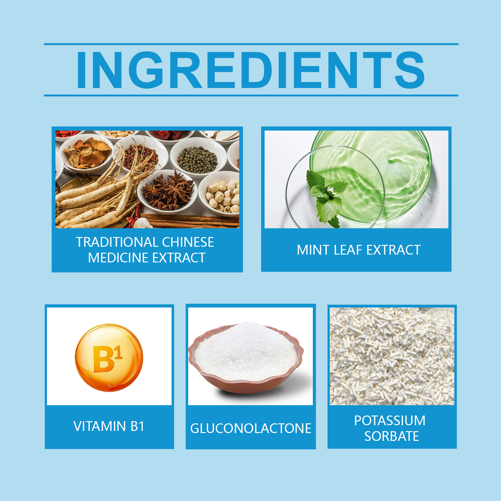 | 成分 | 中药提取物、葡萄糖酸内酯、维生素b1 |