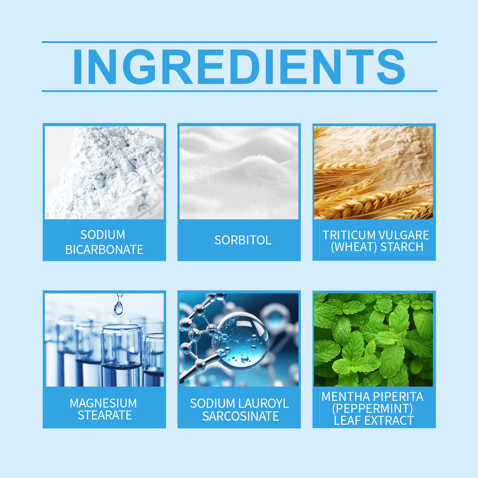 我们的牙齿清洁牙粉含有碳酸氢钠、山梨(糖)醇。它可以提高清洁力,安全抛光牙齿;提供清新的口气和舒适的感觉。照顾牙龈,减少不适。它的使用方法很简单:1.把牙刷弄湿,然后蘸适量本产品。2.用正确的方法刷牙3分钟;3.用清水漱口,直到口腔干净为止。深度清洁牙齿,去除污渍。薄荷香,香味持久。柔软的材料保护牙龈。