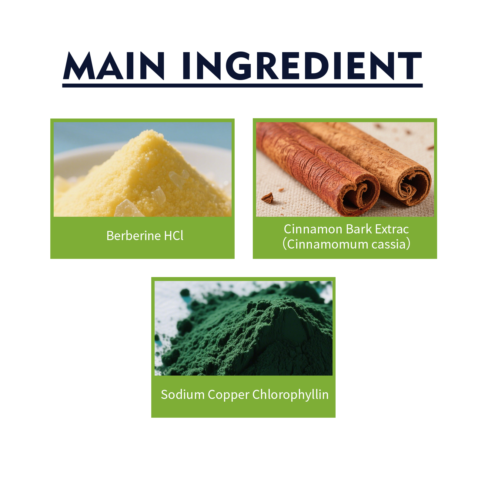 | 成分 | 盐酸小檗碱、肉桂皮提取物(肉桂)、叶绿素铜钠 |