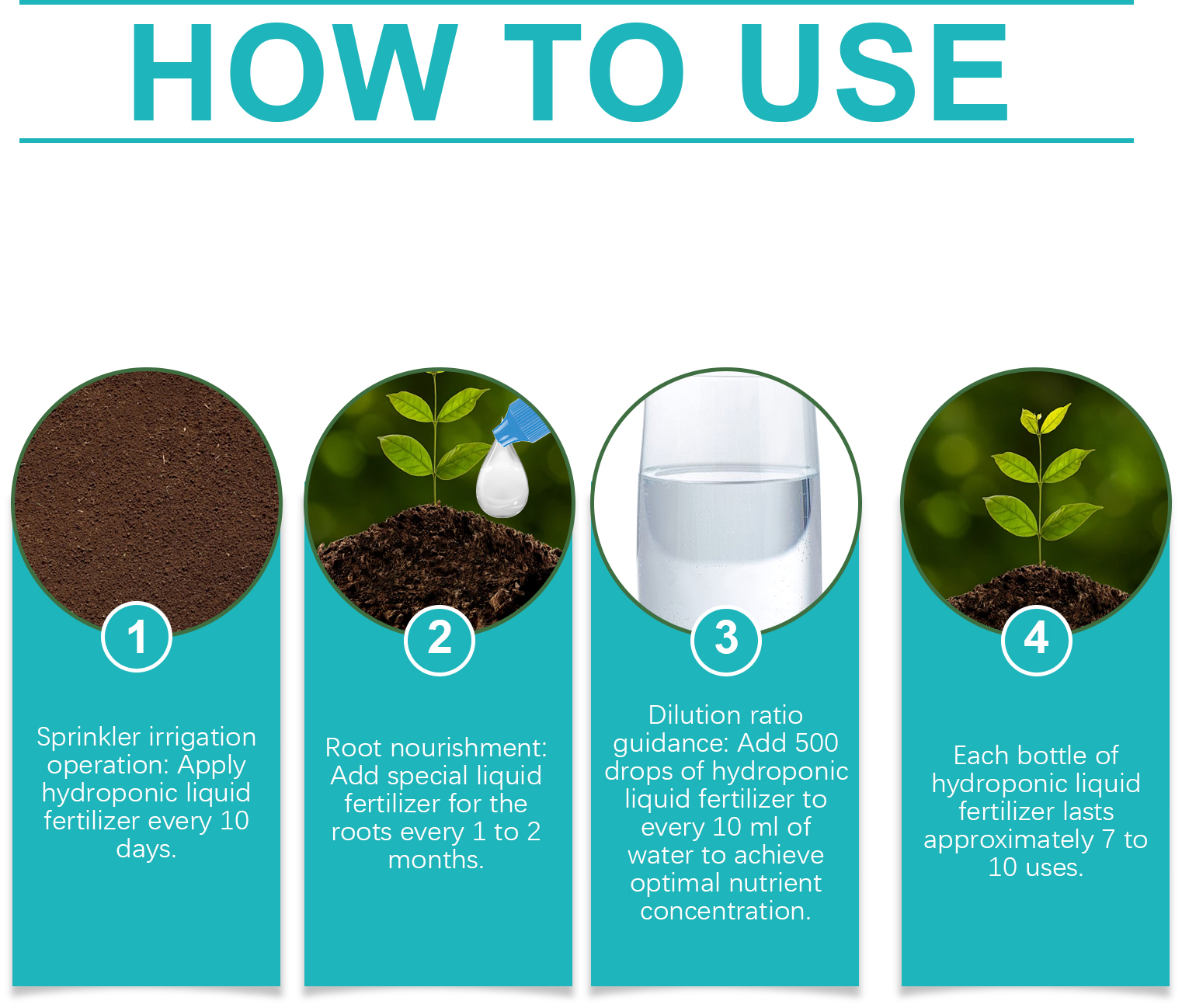 我们的水培液体肥料含有高活性苯基氨基酸、硫酸镁复合物、氯苯氧乙酸。它可以有效吸收养分,快速促进植物生长。提供全面营养,加强根系发育。它的使用方法很简单:1.洒水灌溉操作:每10天施用水培液肥。2.根部营养每1 - 2个月为根部添加专用液体肥料。3.稀释比例指导:每10毫升水中加入500滴水培液肥,以达到最佳营养浓度。4.每瓶水培液体肥料可使用约7至10次。水培液体肥料富含促进根系发育、茎部生长和叶片健康的元素,有效提高植物生长速度。