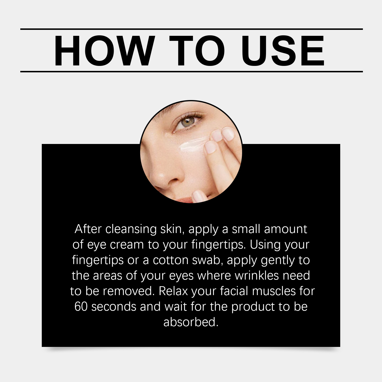 我们的紧致细纹眼霜含有甘油、卡波姆、透明质酸钠。它可以温和配方,适合敏感肌肤。有效提拉紧致眼周肌肤,减少眼袋的出现,让你看起来更年轻。它的使用方法很简单:洁肤后,取少量眼霜涂于指尖。用指尖或棉拭子轻轻涂抹在眼部需要去除皱纹的地方。放松你的面肌60秒,等待产品被吸收。并且可以帮助眼部周围的皮肤变得紧实和时尚。