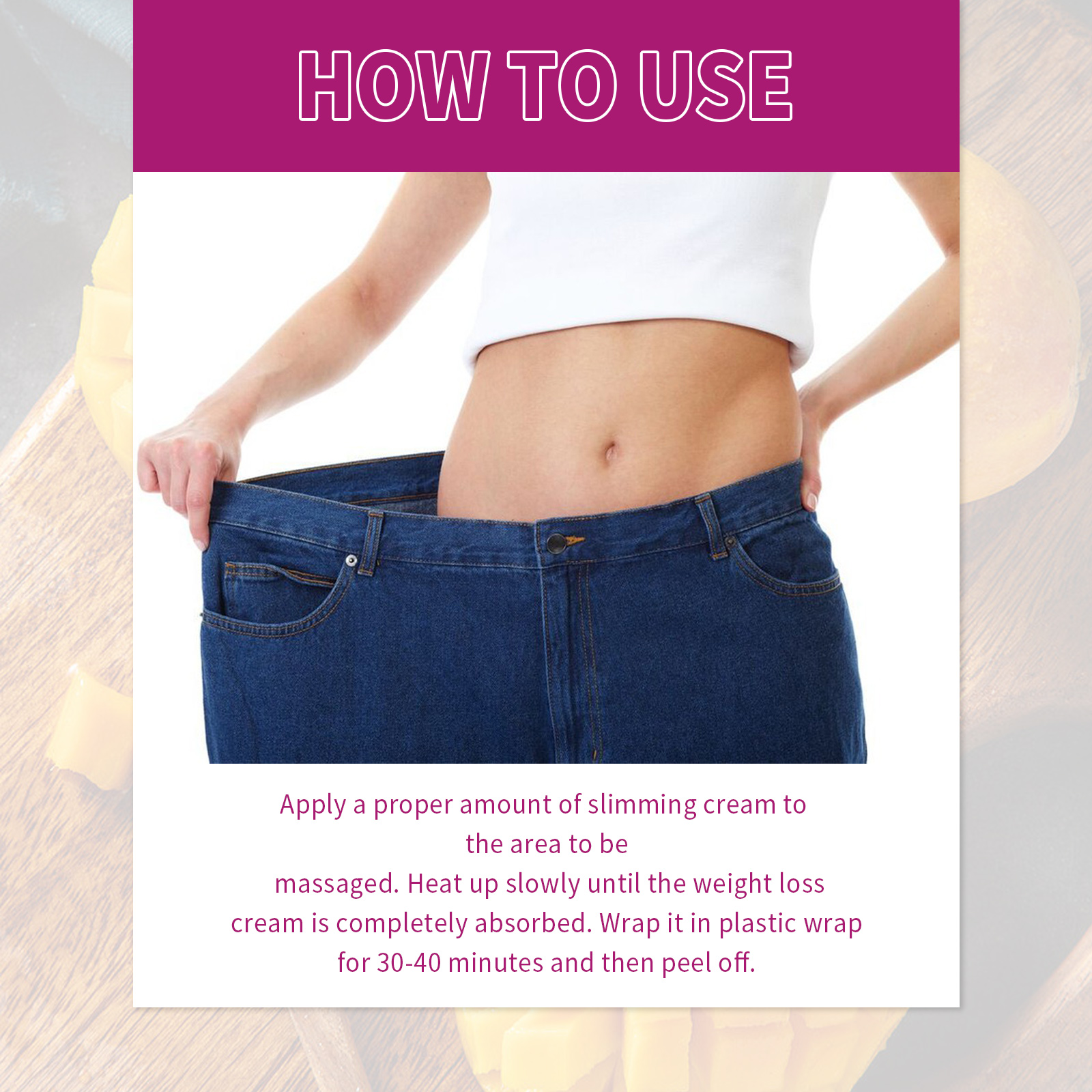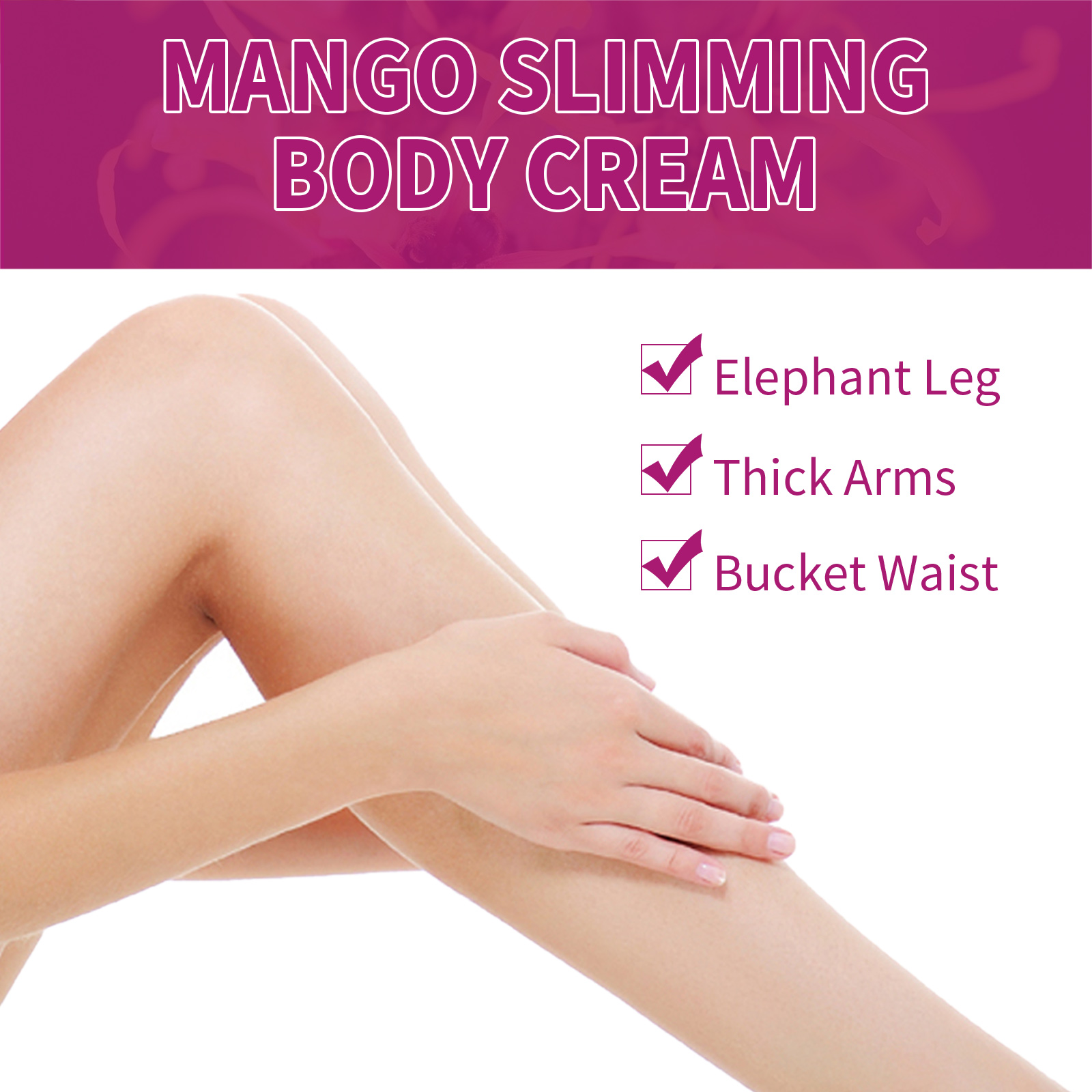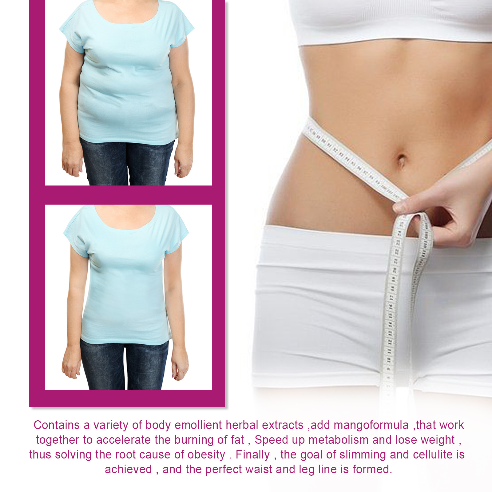 我们的芒果纤体霜含有芒果提取物、积雪草提取物、生姜根提取物。它可以共同加速脂肪燃烧,加快新陈代谢,减肥,从而解决肥胖的根源,最终达到瘦身和脂肪团的目标,形成完美的腰腿线。它的使用方法很简单:首先在需要的部位涂上适量的瘦身霜按摩。慢慢加热,直到减肥霜被完全吸收。用保鲜膜包裹30-40分钟,然后剥落。使用后有助于排出体内的毒素,帮助血管扩张,消除脂肪块的堆积,促进血液流动,提高消化系统的效率,让身材更加苗条。