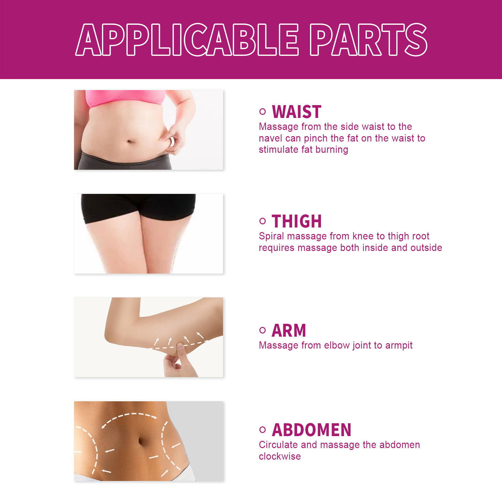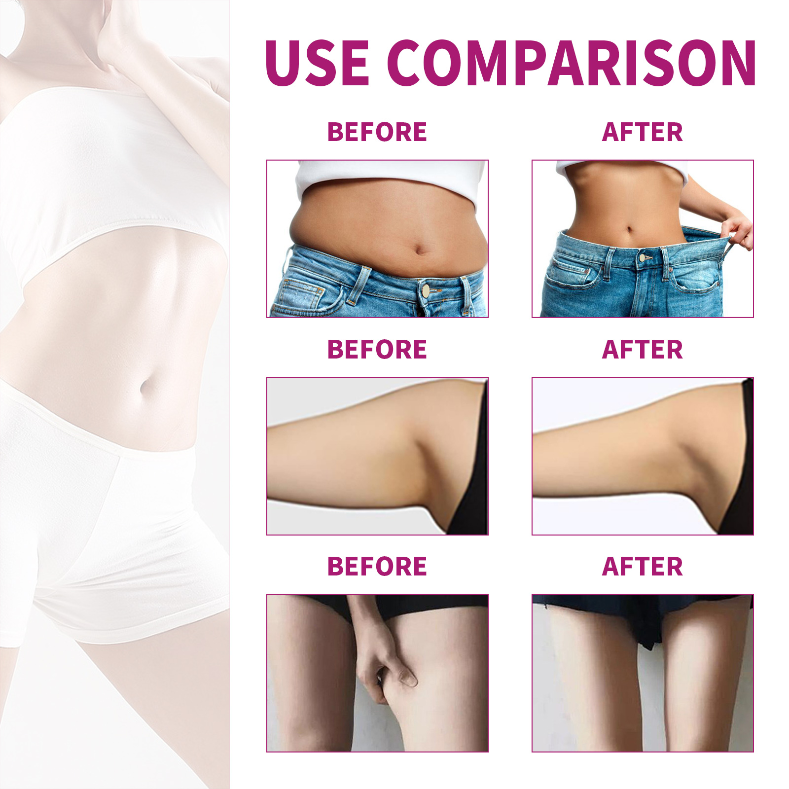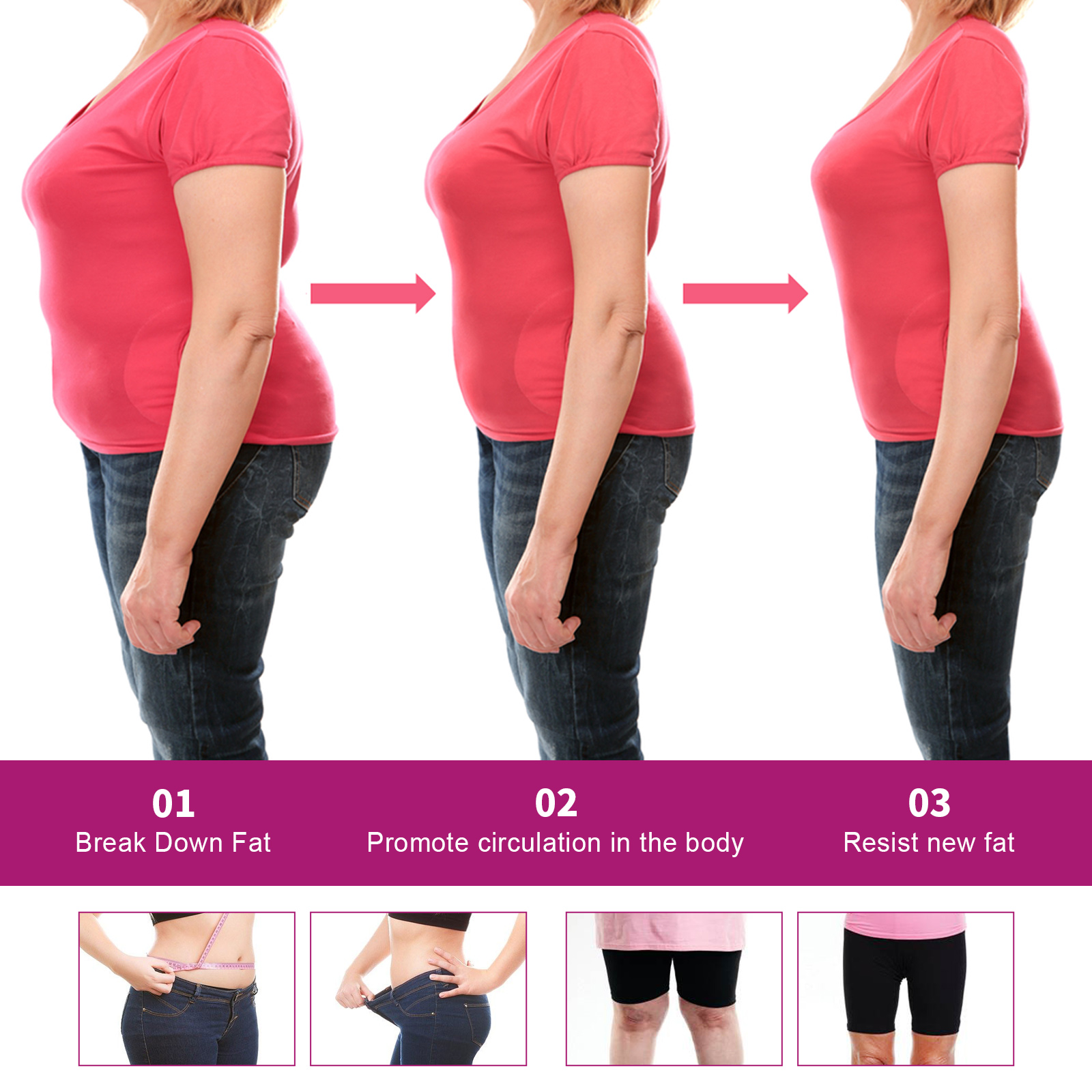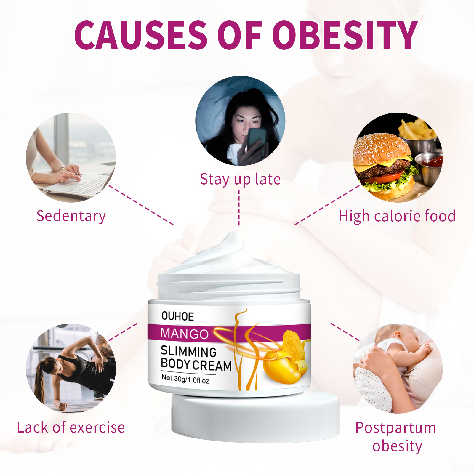 我们的芒果纤体霜含有芒果提取物、积雪草提取物、生姜根提取物。它可以共同加速脂肪燃烧,加快新陈代谢,减肥,从而解决肥胖的根源,最终达到瘦身和脂肪团的目标,形成完美的腰腿线。它的使用方法很简单:首先在需要的部位涂上适量的瘦身霜按摩。慢慢加热,直到减肥霜被完全吸收。用保鲜膜包裹30-40分钟,然后剥落。使用后有助于排出体内的毒素,帮助血管扩张,消除脂肪块的堆积,促进血液流动,提高消化系统的效率,让身材更加苗条。