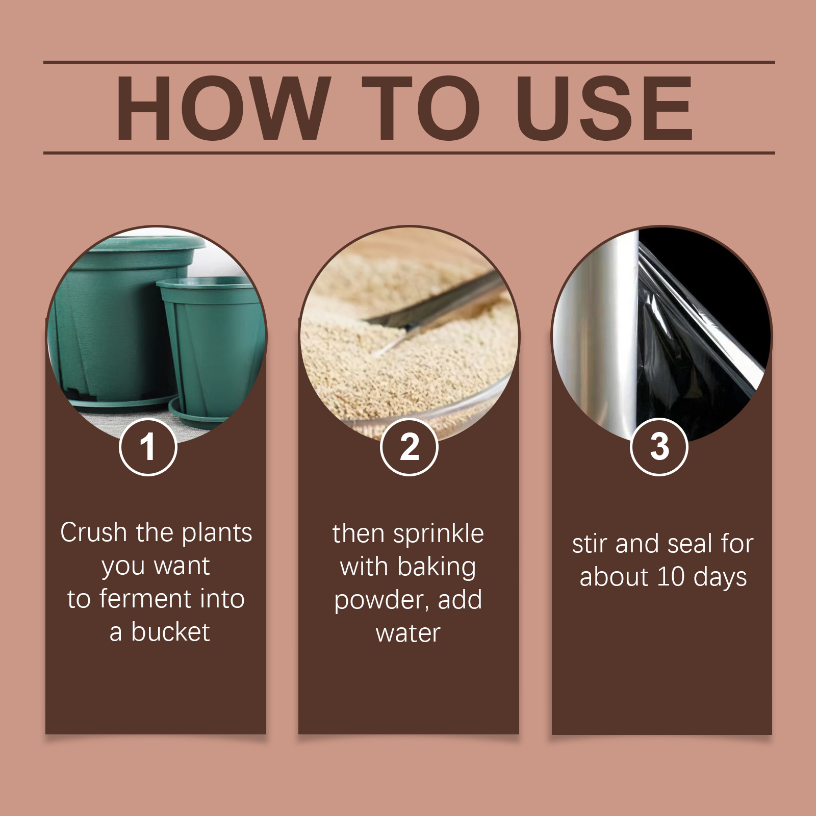 我们的绿色有机生物催化剂含有葡萄糖粉、枯草芽孢杆菌、地衣芽孢杆菌。它可以有效提高土壤肥力,促进植物健康生长。通过生物催化剂促进植物营养吸收。它的使用方法很简单:1.把要发酵的植物压碎放进桶里;2.然后撒上发酵粉,加水;3.搅拌并密封约10天。优化植物对土壤养分的吸收和利用。松散活化土壤,调节土壤,促进土壤生根。
