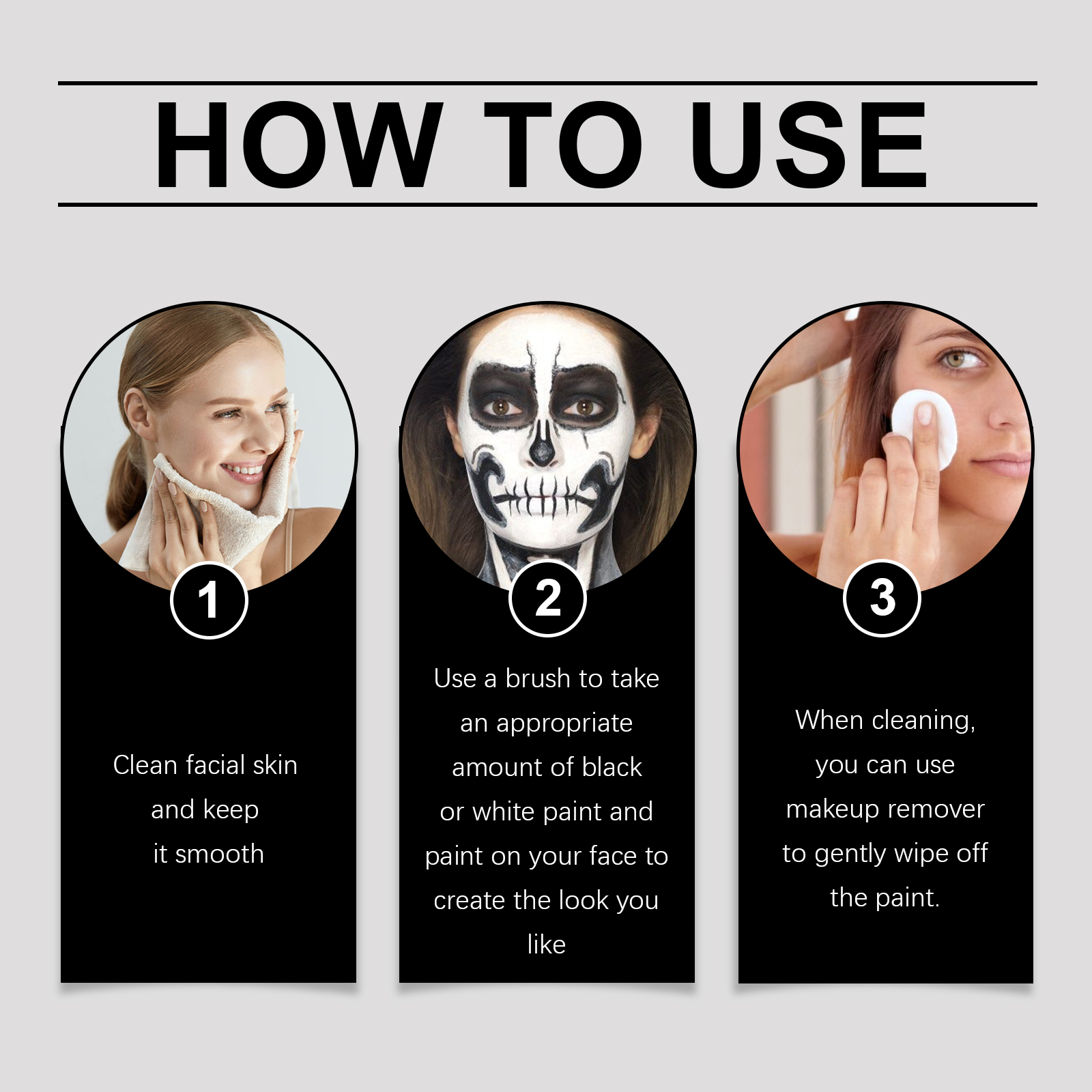 我们的万圣节黑白身体彩绘含有硅油、异丙醇。它可以避免在应用过程中的混色,并保持图案清晰。它的使用方法很简单:清洁面部皮肤,保持光滑,用画笔取适量的黑色或白色颜料,涂在脸上,创造出你喜欢的样子,清洁时,可以用卸妆液轻轻擦去颜料。并且可以保证了均匀的颜色,良好的覆盖率,完美的妆效。