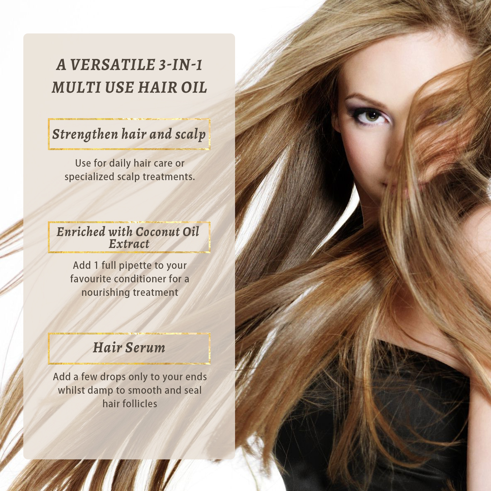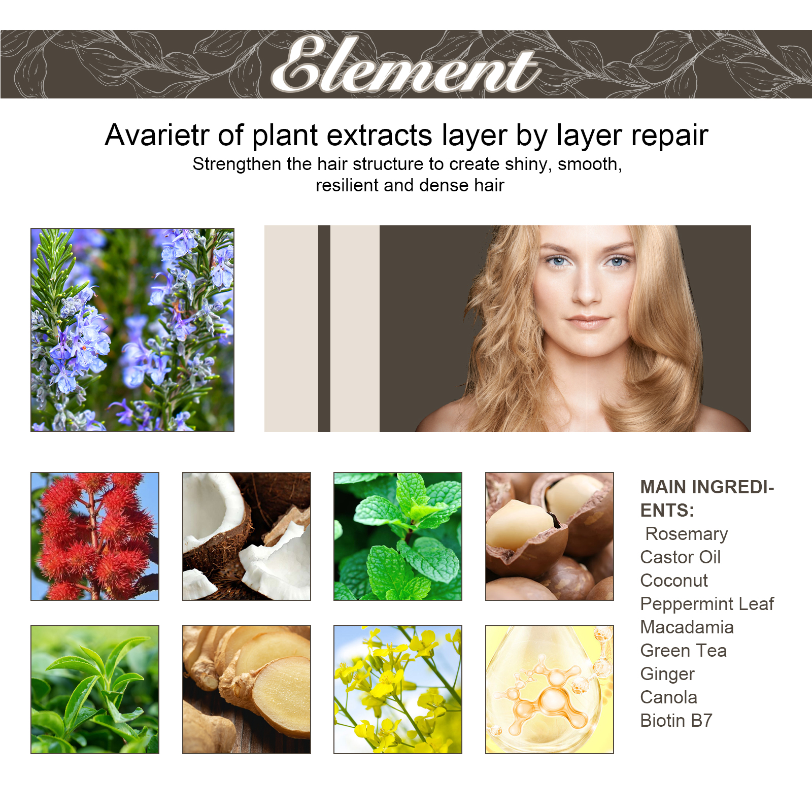 我们的密发精油含迷迭香、蓖麻油、椰子。它可以修护受损毛发,深层滋养头皮,还能改善毛囊的健康,促进头发生长,蓖麻油可以保持头发水分,其中的脂肪酸还可以补充头发的天然油脂,保护头发。它的使用方法很简单:洗完头发后,用毛巾或电吹风将头发吹至半干,再取适量本品均匀涂抹于发梢和发丝上,用手指抓紧协助吸收,最后用冷风吹干即可。可以唤醒休眠的毛囊,有效改善干枯毛躁的问题,促进新毛发的生长,使毛发更加健康浓密。