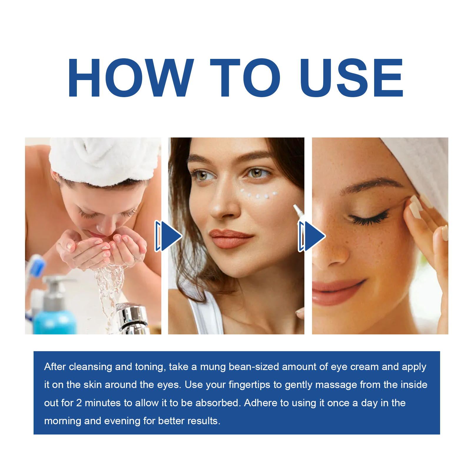 我们的视黄醇眼霜含有视黄醇、曲酸、咖啡提取物。它可以淡化浮肿,消除眼袋,淡化眼部皱纹、色斑,滋润滋养眼部肌肤,提亮眼部,淡化黑眼圈,紧致肌肤,防止下垂。它的使用方法很简单:洁面爽肤后,取绿豆大小的眼霜涂抹在眼周皮肤上。用指尖从内到外轻轻按摩2分钟,让它被吸收。淡化黑眼圈,消肿,平滑眼袋,抑制黑色素形成,减轻浮肿和黑眼圈。
