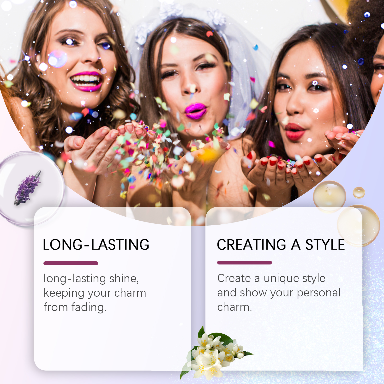我们的炫彩闪光喷雾含有甘油、薰衣草油、甜橙花油。它可以保证肌肤闪亮油能长时间保持闪亮的效果,散发出迷人的光芒,保持肌肤的光泽,提供色彩和效果的选择,让您根据自己的喜好和派对主题,打造出独特的闪亮造型,展现出您的个人魅力。它的使用方法很简单:使用前摇匀,在离身体、头发或衣服20-30厘米的距离处按压泵头,等待60秒,使其在表面被吸收即可。为节日聚会量身定制,完美融入节日气氛,让您成为聚会的焦点。