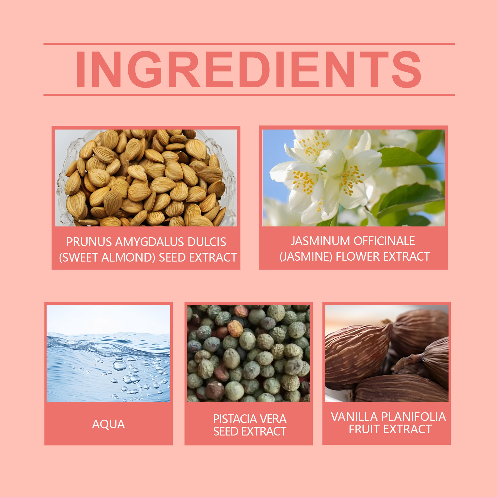 | 成分 | 甜杏仁籽提取物、黄连木籽提取物、茉莉花提取物 |
