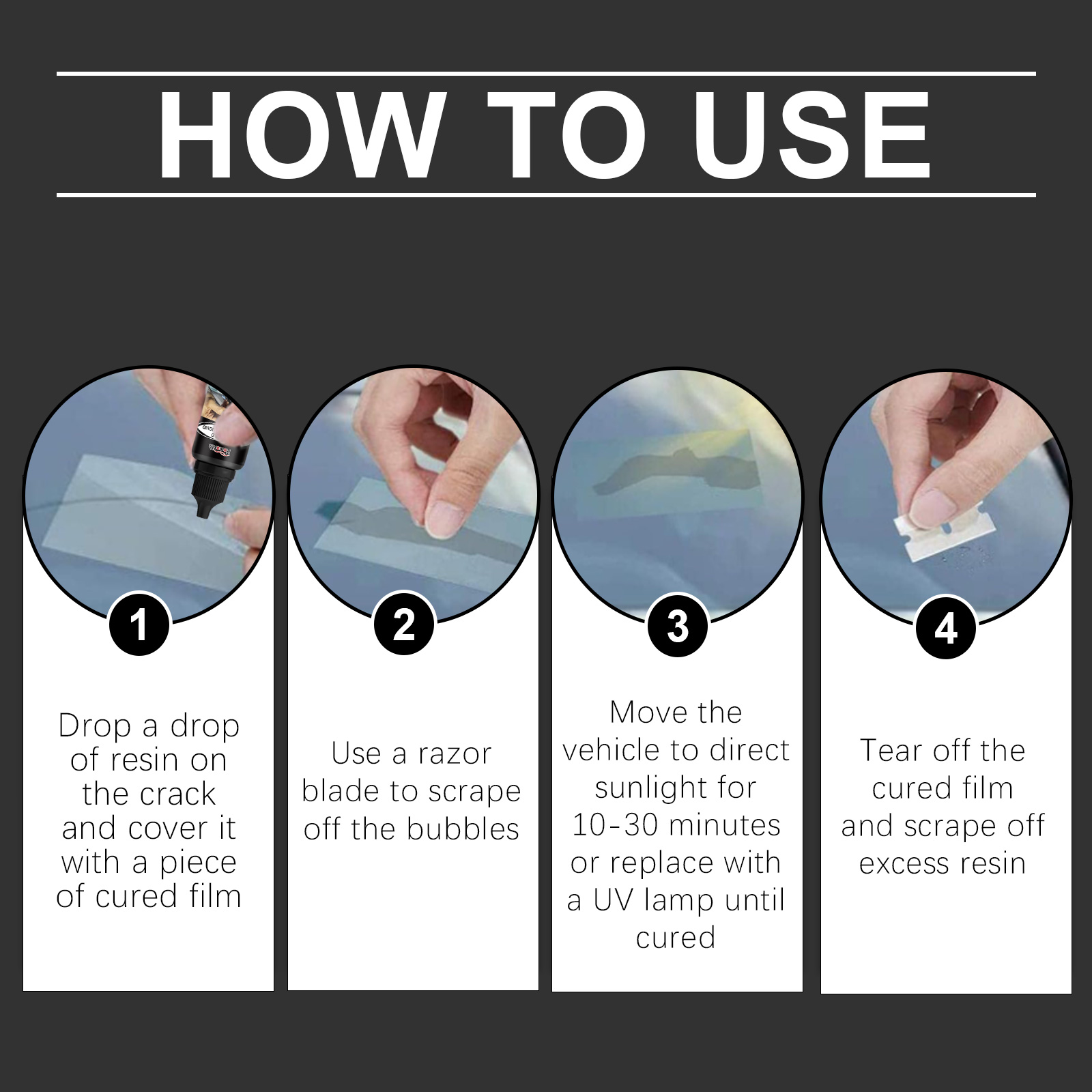 我们的汽车挡风玻璃修复液含有去离子水、纳米氧化钛、矿物油。它可以快速渗入玻璃裂纹,短时间内修复玻璃表面。防止玻璃裂纹的扩大,增强玻璃的稳定性,提高您的行车安全性。它的使用方法很简单:1. 在裂缝上滴一滴树脂,用一块固化膜覆盖;2. 用剃须刀片刮掉气泡;3. 将车辆移到阳光直射下10-30分钟,或更换为紫外线灯,直到固化;4. 撕开固化膜,刮去多余的树脂。修复后的玻璃可以恢复到接近其原始强度,延长玻璃的使用寿命。