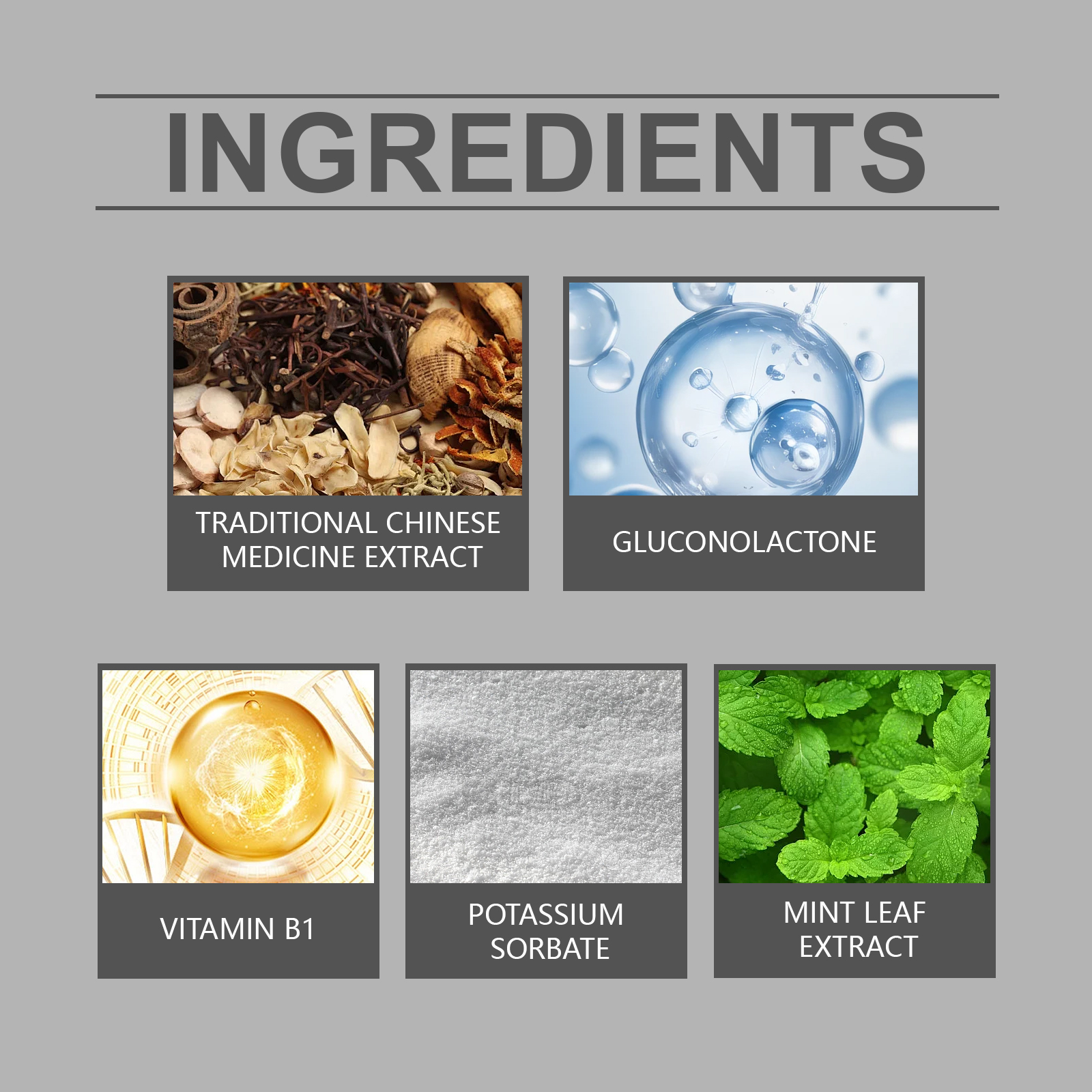 | 成分 | 中药提取物、葡萄糖酸内脂、维生素b1 |