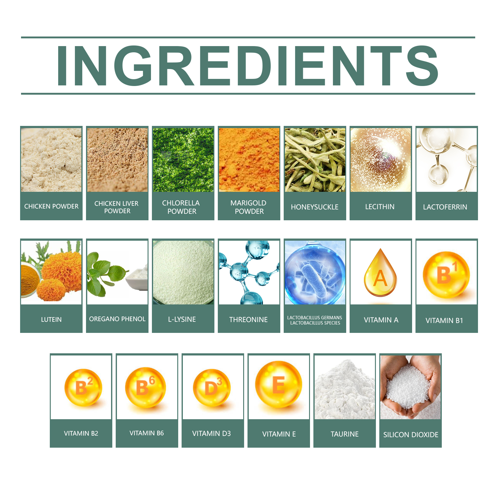 | 成分 | 鸡肉粉、鸡肝粉、小球藻粉 |