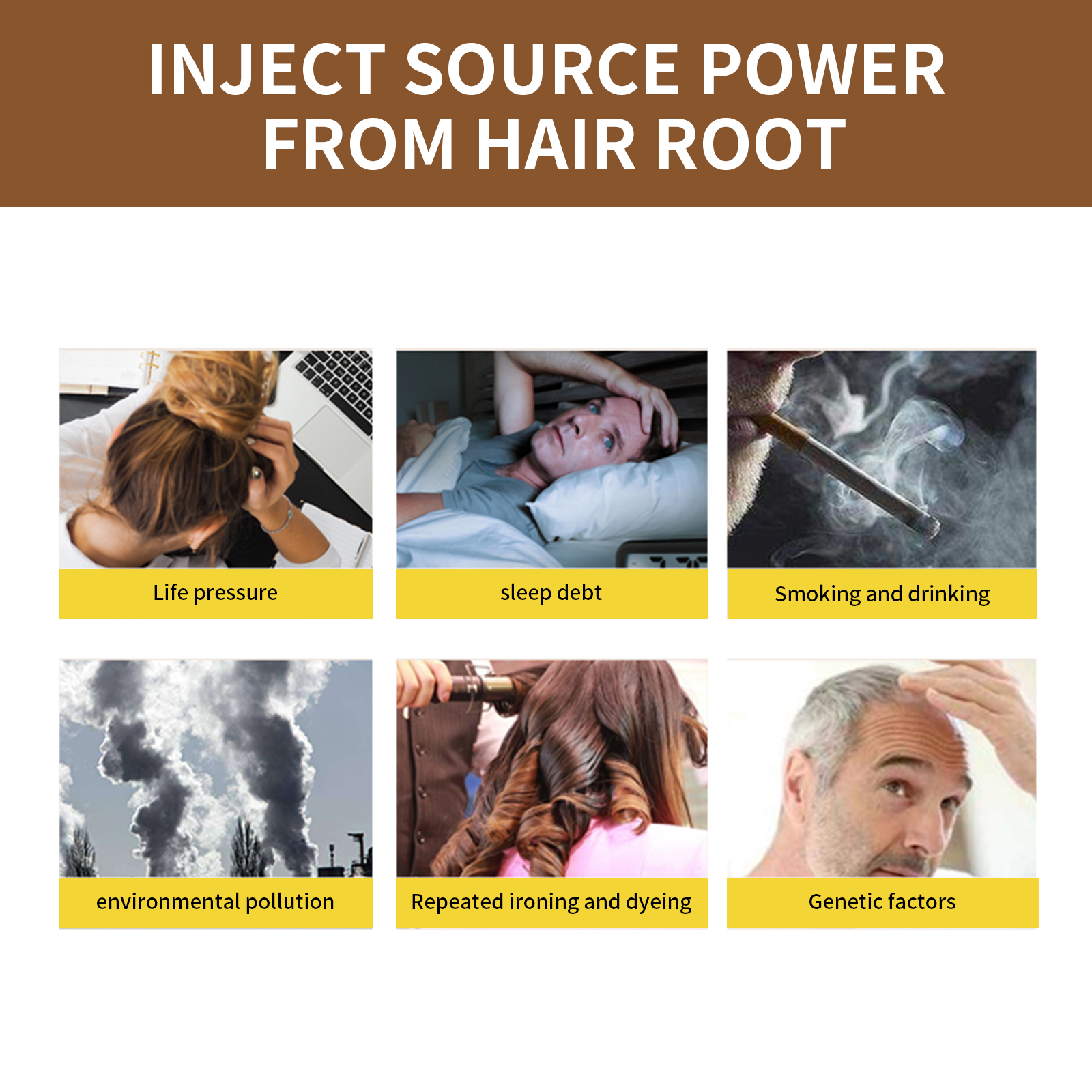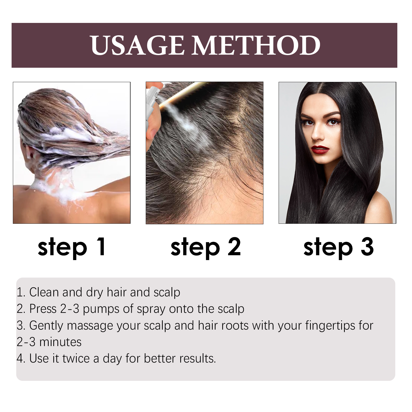 我们的黑发喷雾含有何首乌提取物、丝柏提取物、当归提取物。它可以增加毛囊活力,改善头皮微环境,促进头发生长,改善头发老化、毛球氧化、经常染发带来的头发毛躁。它的使用方法很简单:清洁和干燥头发和头皮,在头皮上喷2-3次,用指尖轻轻按摩头皮和发根2 - 3分钟,每天使用两次效果更好。黑发喷雾滋养黑发,遮盖白发,使头发柔顺、自然、亮泽。