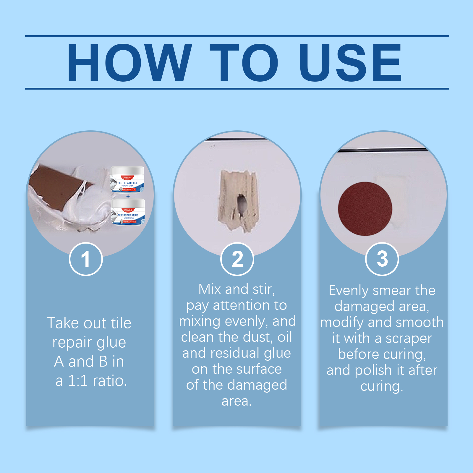 我们的瓷砖修复胶(瓷白色)含有甲基纤维素溶液,成膜助剂助剂。它可以高强度附着力,防水防漏,确保长效修复效果。它的使用方法很简单:戴好手套。按1:1比例取出瓷砖修复胶A和B混合搅拌,注意搅拌均匀,并将破损处表面灰尘,油污,残胶清洁干净。在破损处周围贴上美纹纸,然后将修复胶均匀涂抹。固化前用刮板刮平整,固化后撕下美纹纸,并用砂纸进行打磨。并且可以适用于修复瓷砖、浴缸、瓷器等各种表面上的划痕、孔洞和缝隙。