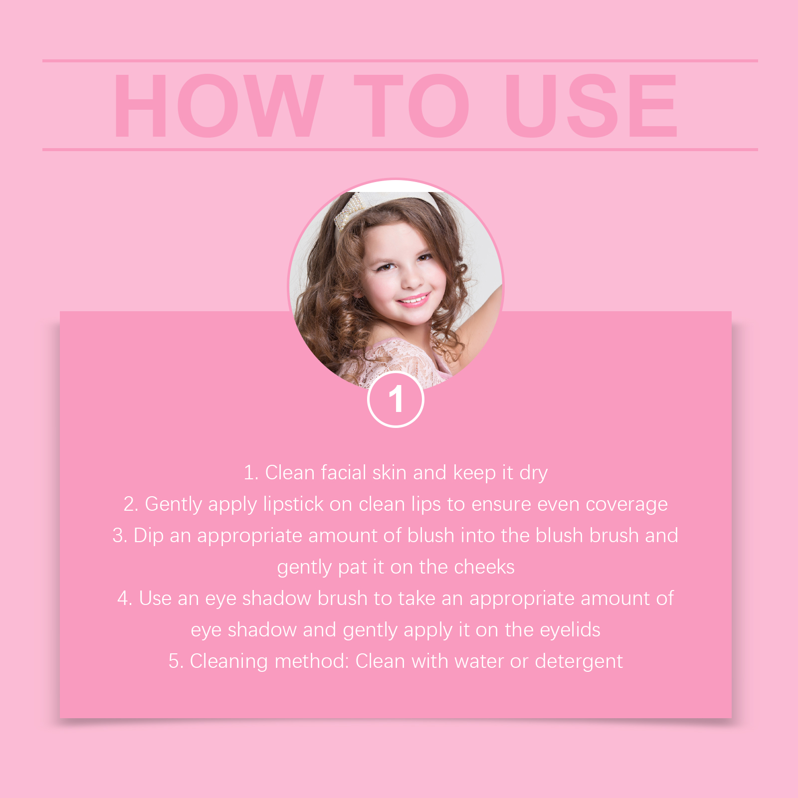 我们的儿童彩妆礼盒含有眼影腮红:玉米淀粉、云母;口红:蜂蜡、乳木果油。它可以提供多种颜色选择,激发孩子的创造力和想象力。它的使用方法很简单:1.清洁面部皮肤,保持皮肤干燥,2.在干净的嘴唇上轻轻涂抹口红,确保均匀覆盖,3.用腮红刷蘸取适量腮红,轻轻拍打在脸颊上,4.用眼影刷取适量的眼影,轻轻地涂在眼睑上,5.清洗方法:用水或洗涤剂清洗。并且采用温和配方,确保儿童安全使用。