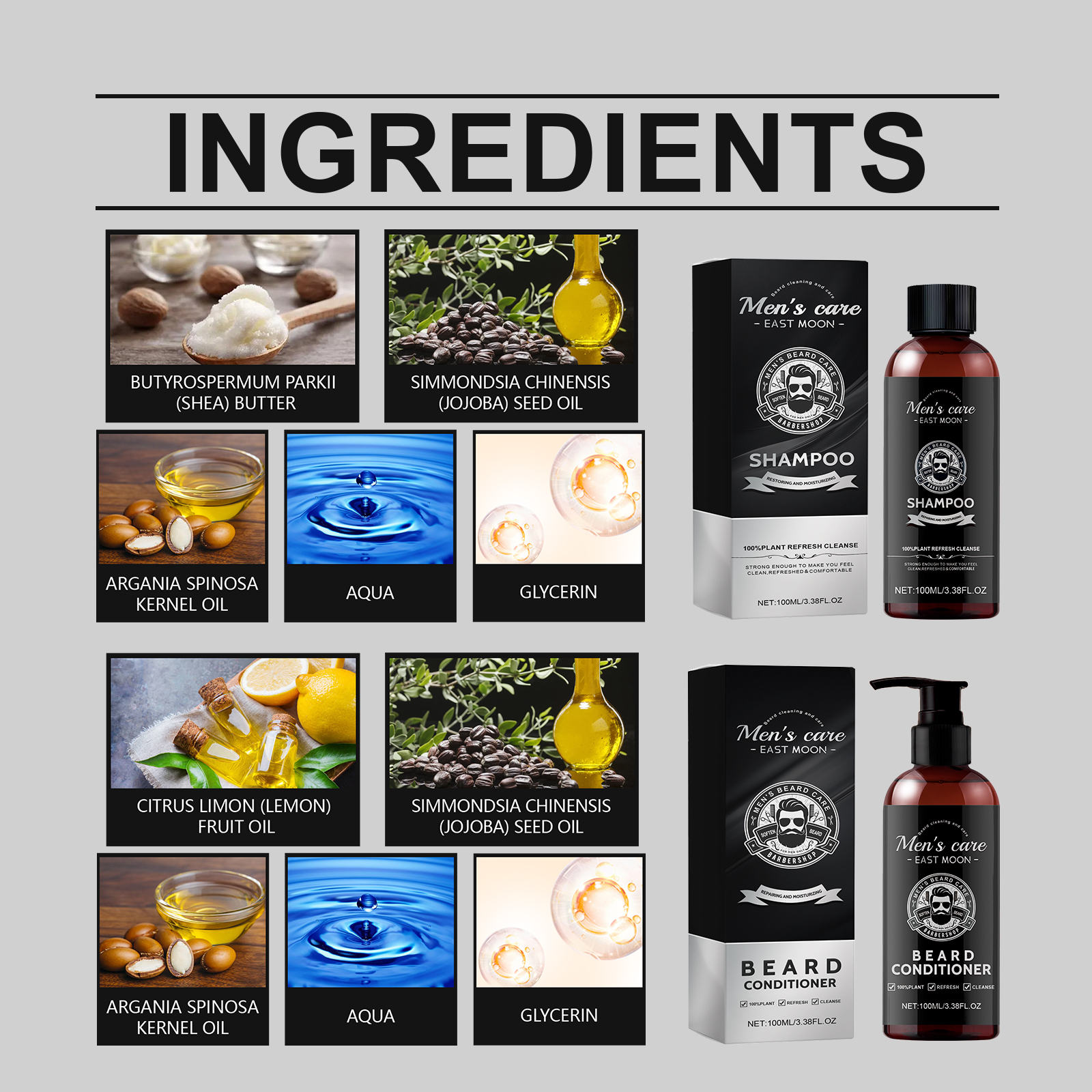 我们的胡须洗护两件套含有摩洛哥坚果油、霍霍巴籽油。它可以深层清洁,同时保持胡须湿润。它的使用方法很简单:用温水湿你的胡子,取适量的胡须洗发水,均匀地涂在胡须上,轻轻揉搓,直到出现丰富的泡沫,再用清水冲洗干净。并且可以清除污垢,减少皮肤刺激促进胡须健康生长。