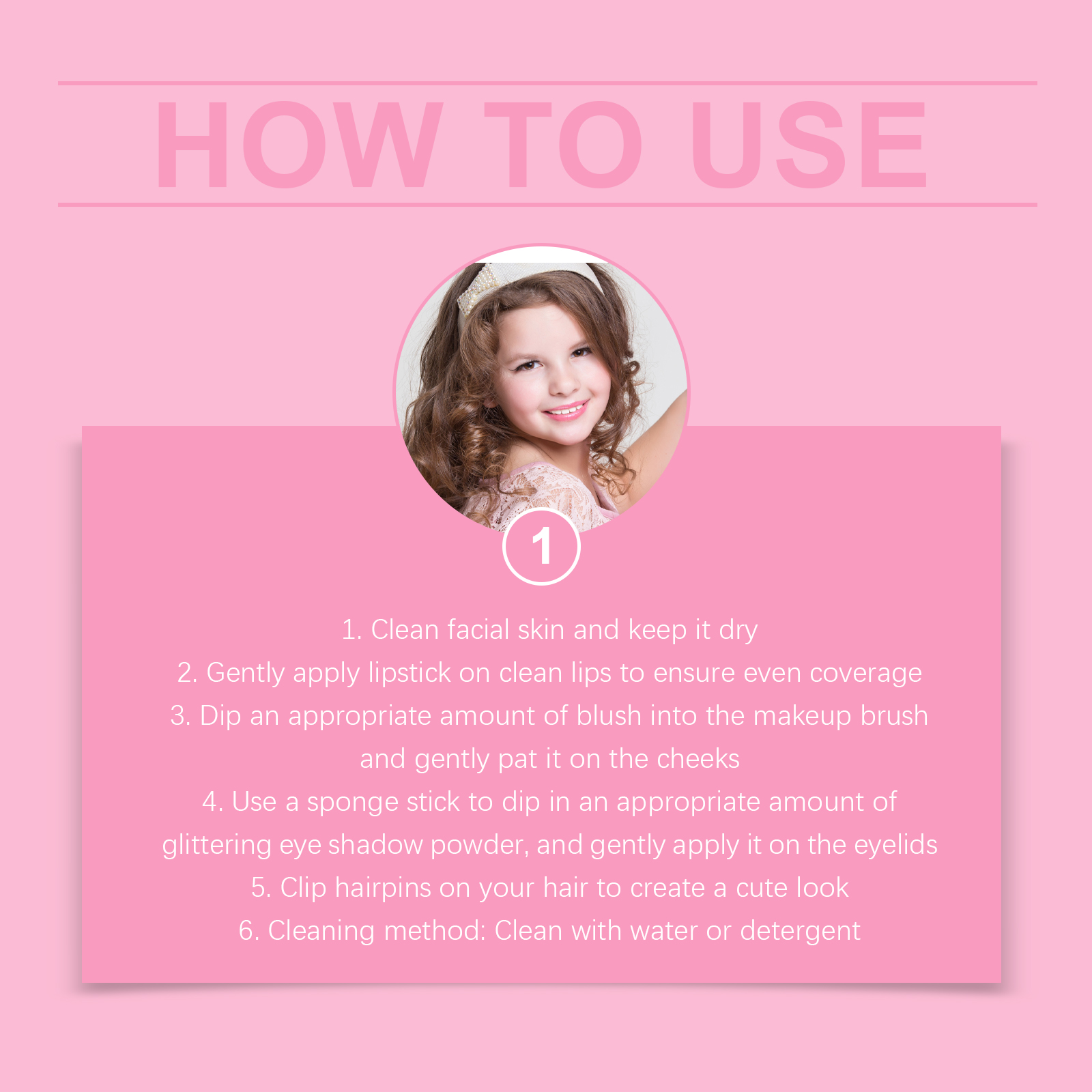 我们的儿童彩妆套装礼盒含有玉米淀粉、云母、硬脂酸锌。它可以提供保湿保护和防止干燥和开裂;深层滋养,保持肌肤柔软。天然保湿和增强唇彩。它的使用方法很简单:1. 清洁面部皮肤,保持干燥;2. 轻轻地将口红涂在干净的嘴唇上,以确保均匀覆盖;3. 用化妆刷蘸适量腮红,轻轻拍在脸颊上;4. 用海绵棒蘸取适量亮闪闪的眼影粉,轻轻涂抹在眼睑上;5. 在头发上别上发夹,让自己看起来更可爱;6. 清洗方法:用水或洗涤剂清洗。采用温和配方,确保儿童安全使用。提供多种颜色选择,激发孩子的创造力和想象力。