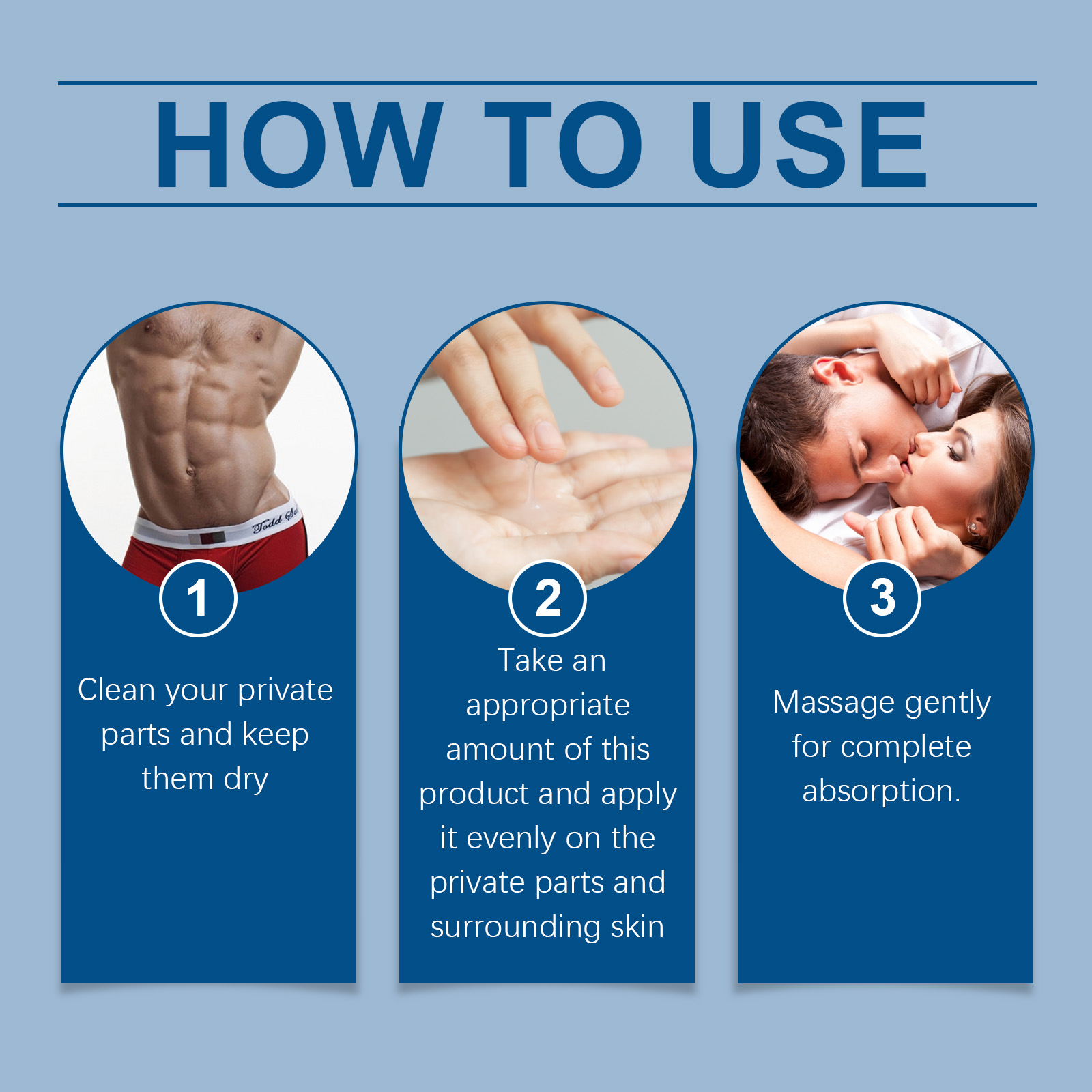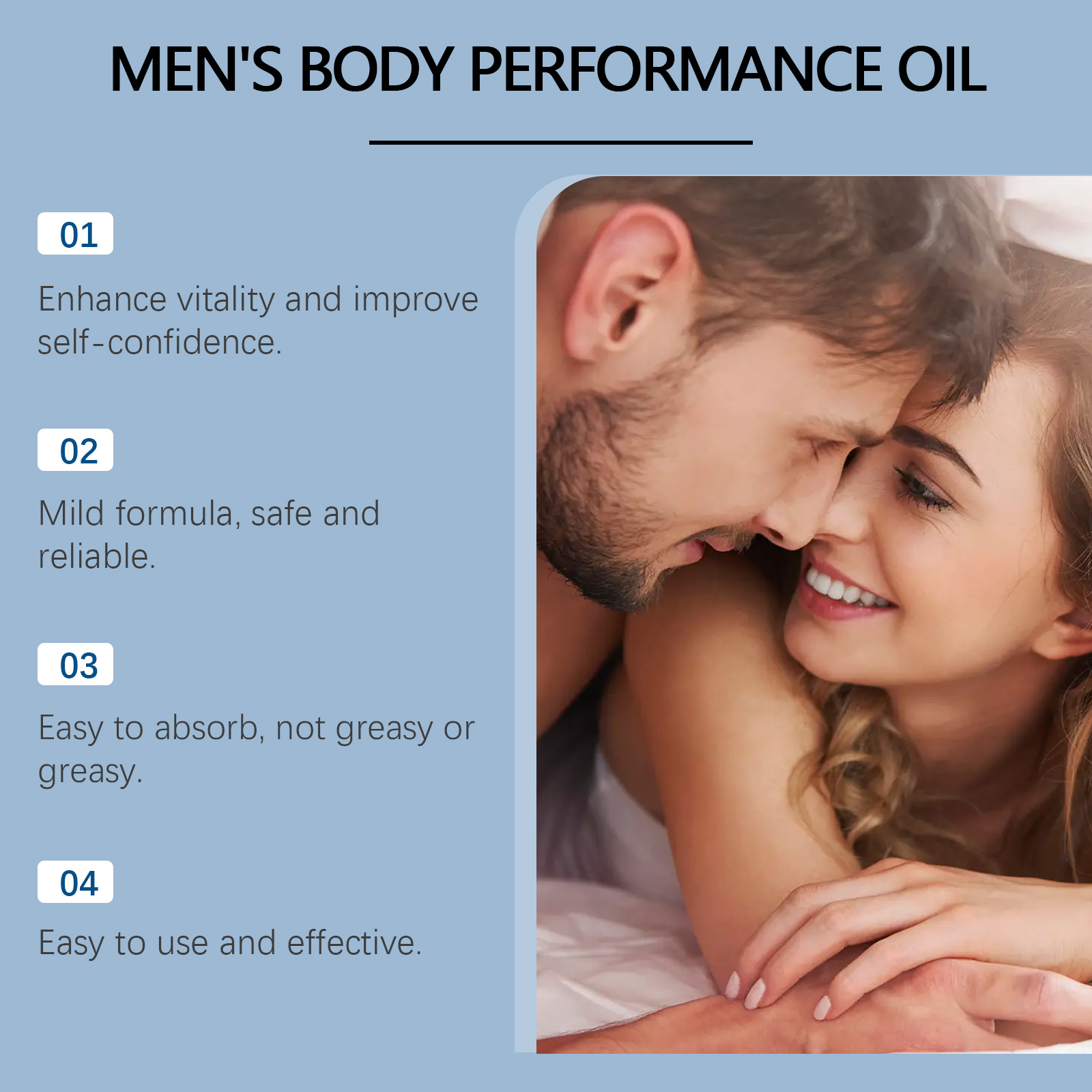 我们的男士效能精油含有椰子油、透明质酸钠、芦荟叶提取物。它可以提供持久的保湿,使皮肤柔软光滑。温和配方,适合所有肤质,无刺激性。它的使用方法很简单:1.清洁你的私处并保持干燥;2.取适量本品均匀涂抹于私处及周围肌肤;3.轻轻按摩直至完全吸收。专为男士设计,帮助增加活力和自信。