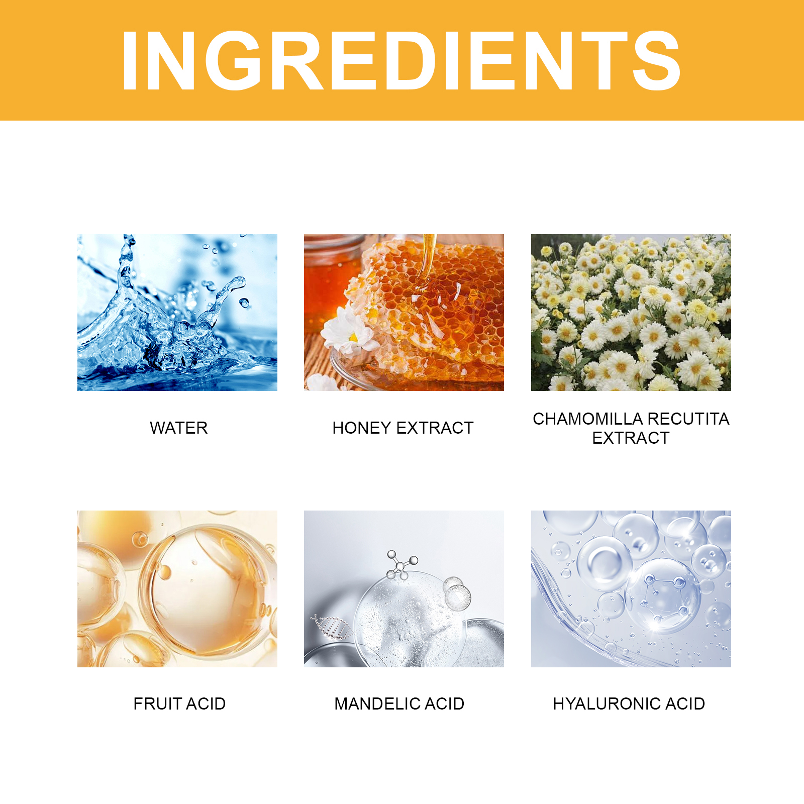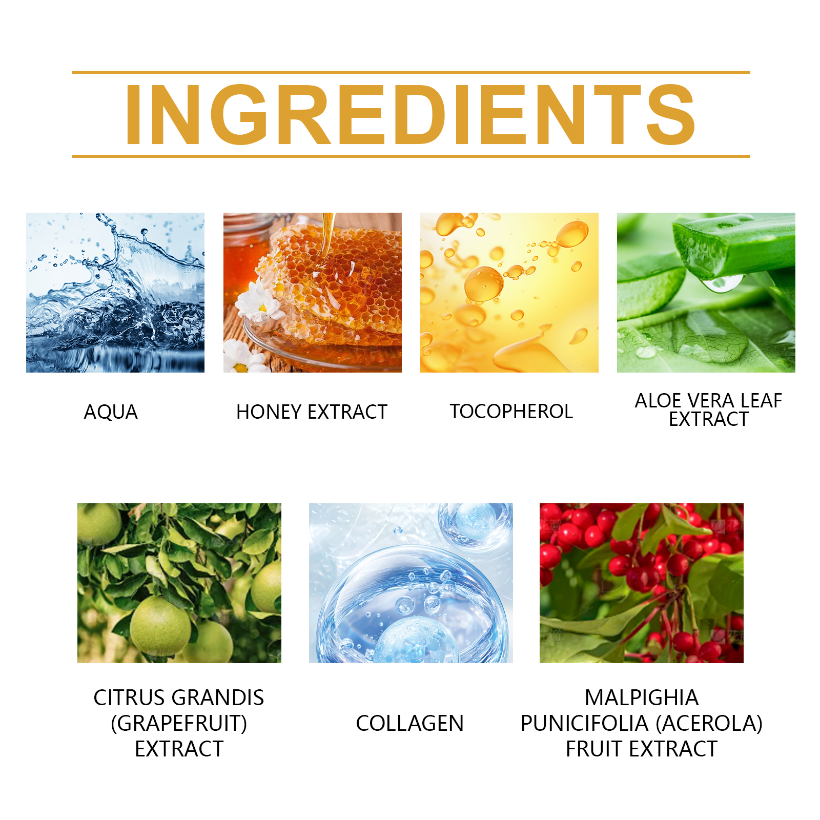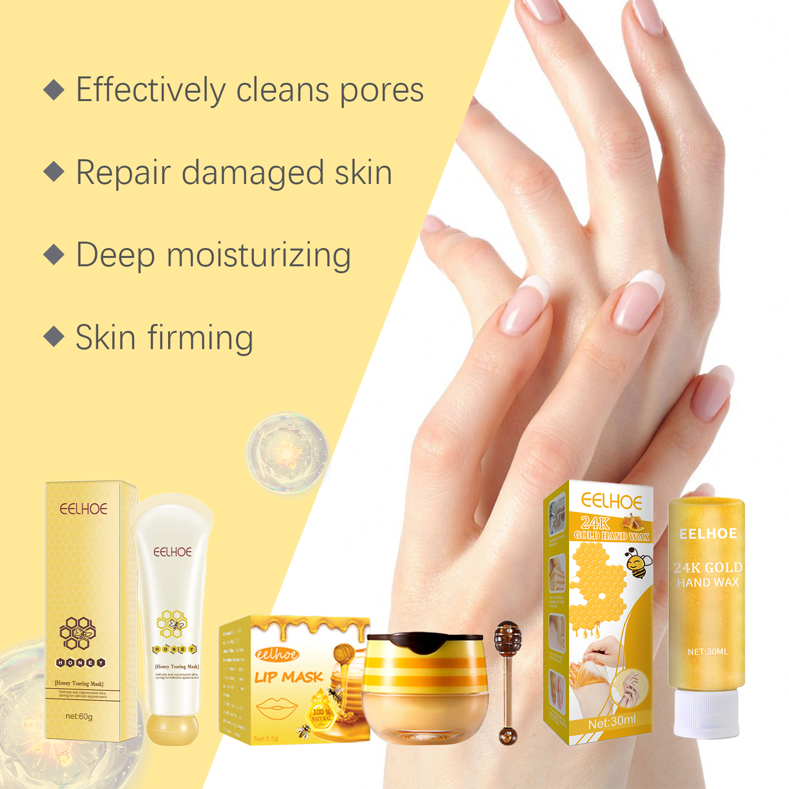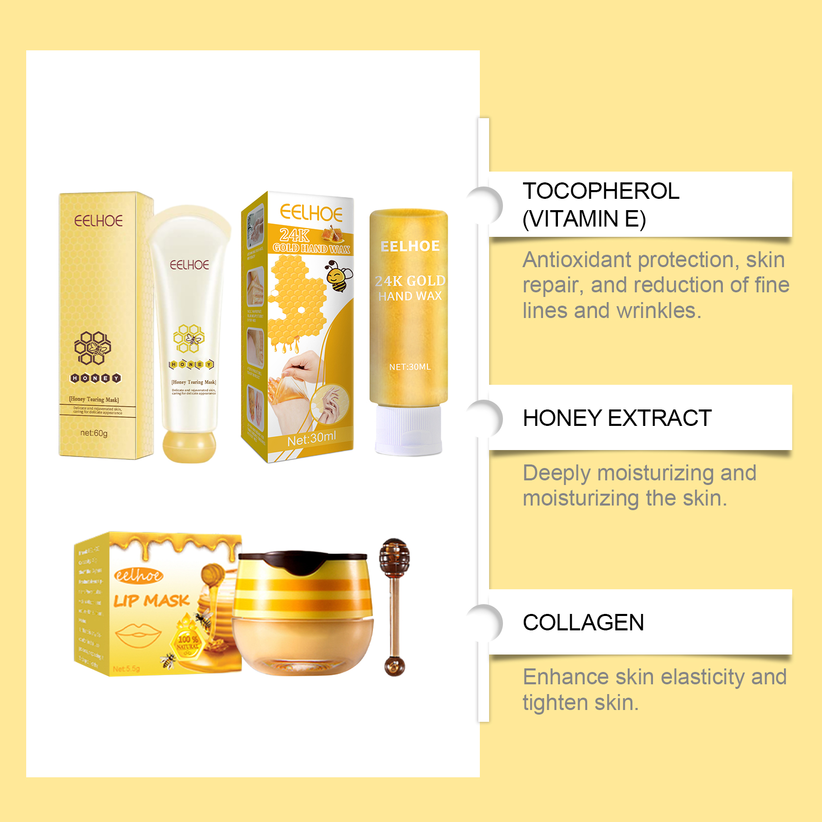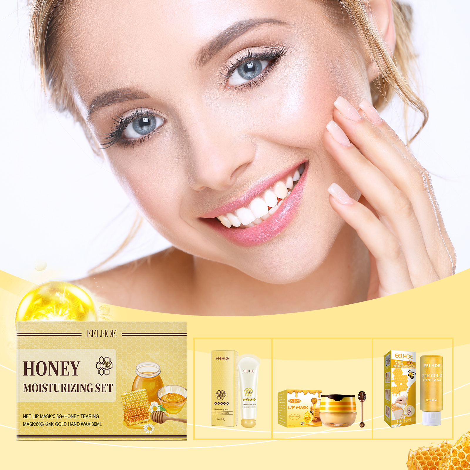 我们的蜂蜜系列保湿去死皮套装含有唇膜:化州柚提取物、红叶金虎尾果;面膜:蜂蜜提取物、母菊花;手膜:蜂蜜提取物、透明质酸。它可以深层滋润肌肤,增强肌肤光泽。温和去除老化角质层,不伤害皮肤,恢复皮肤光滑。它的使用方法很简单:蜂蜜唇膜:1. 睡觉前,用自己的唇刷蘸适量的面霜。2. 睡前将唇膜厚涂在嘴唇上,不需要清洗。3. 第二天早上用化妆棉擦拭唇膜和角质即可。蜂蜜撕拉面膜:1. 用温水洗脸。2. 取适量本品均匀涂抹于面部。3. 等待15-20分钟,蜂蜜的营养被充分吸收。从下巴缩回到前额。黄金蜂蜜手膜:1. 洗手后,把它们擦干;2. 取适量,均匀涂抹在手上;3. 待产品干燥后,撕掉产品;4. 让你的双手重获往日的白嫩柔滑。长效保湿,锁住水分,改善干燥粗糙肌肤。