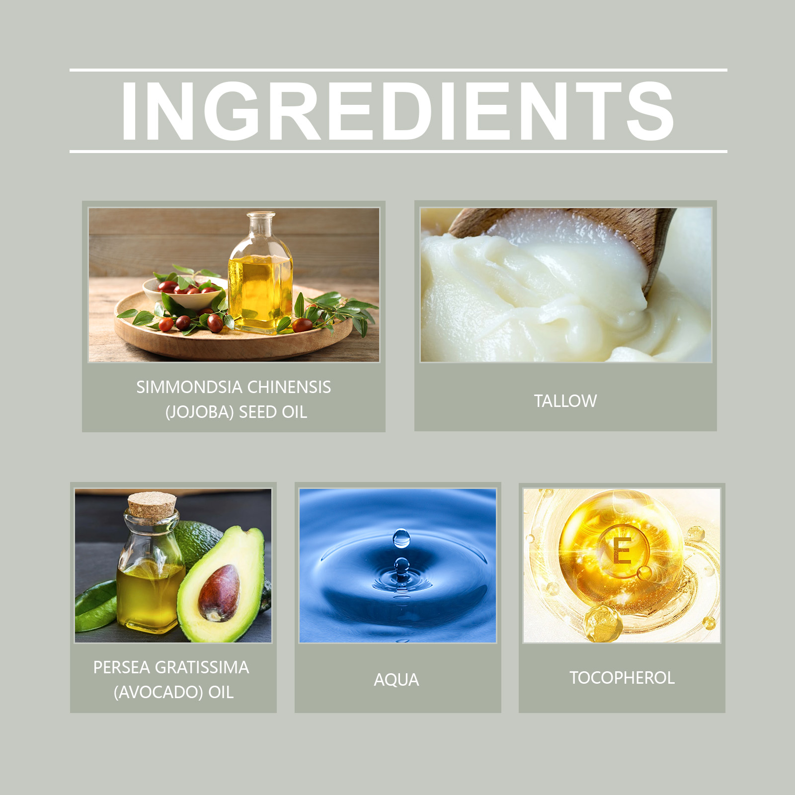 我们的牛脂膏,由霍霍巴籽油、鳄梨油精心调配而成。专为有效舒缓肌肤不适,修复受损屏障,减少红肿设计。使用方法极为便捷:彻底清洁皮肤,先擦干,取适量本品均匀涂抹于面部、手部、足部、肘部、膝部等全身肌肤,轻轻按摩,促进更好的吸收。并且可以深层滋润肌肤,让肌肤一整天都保持水分。