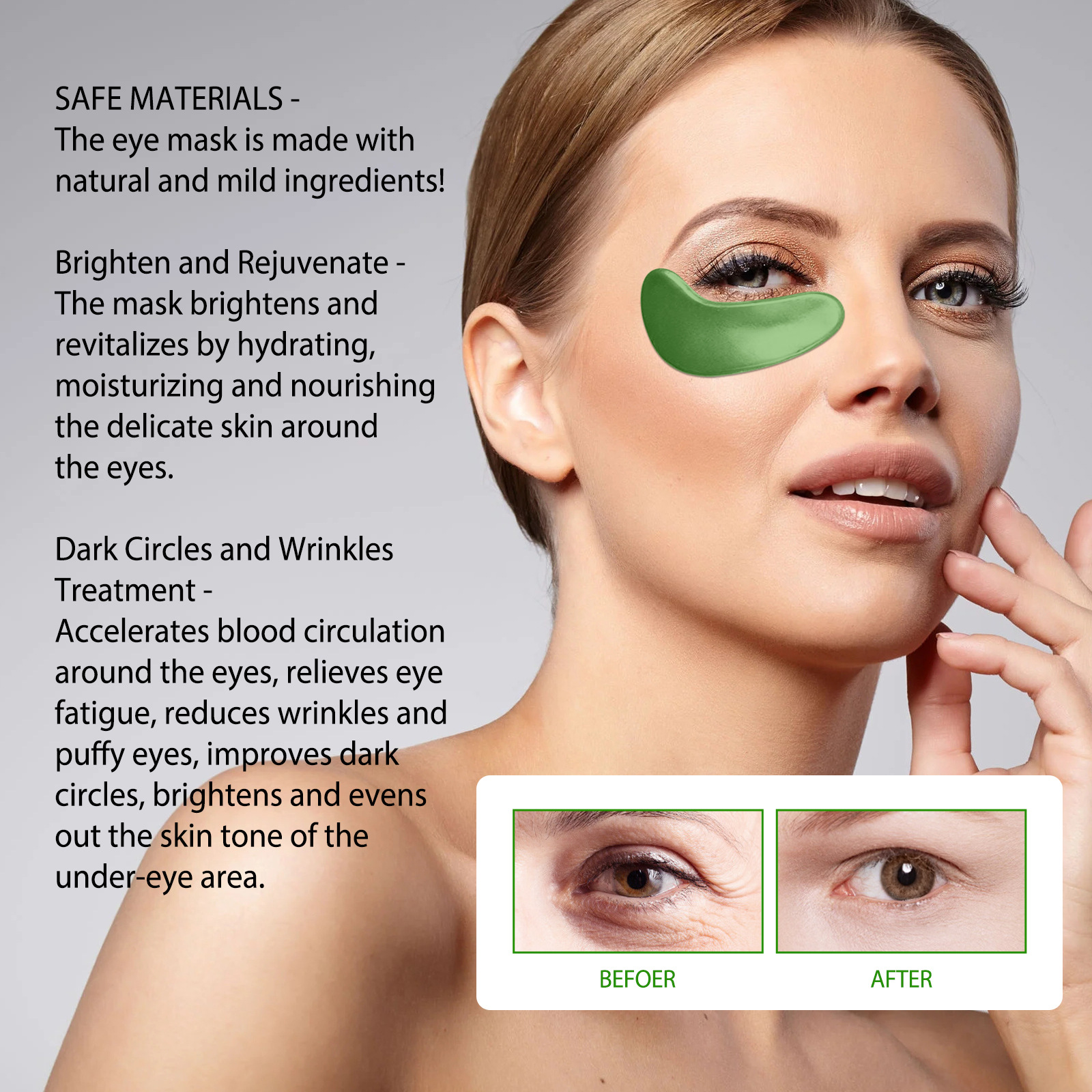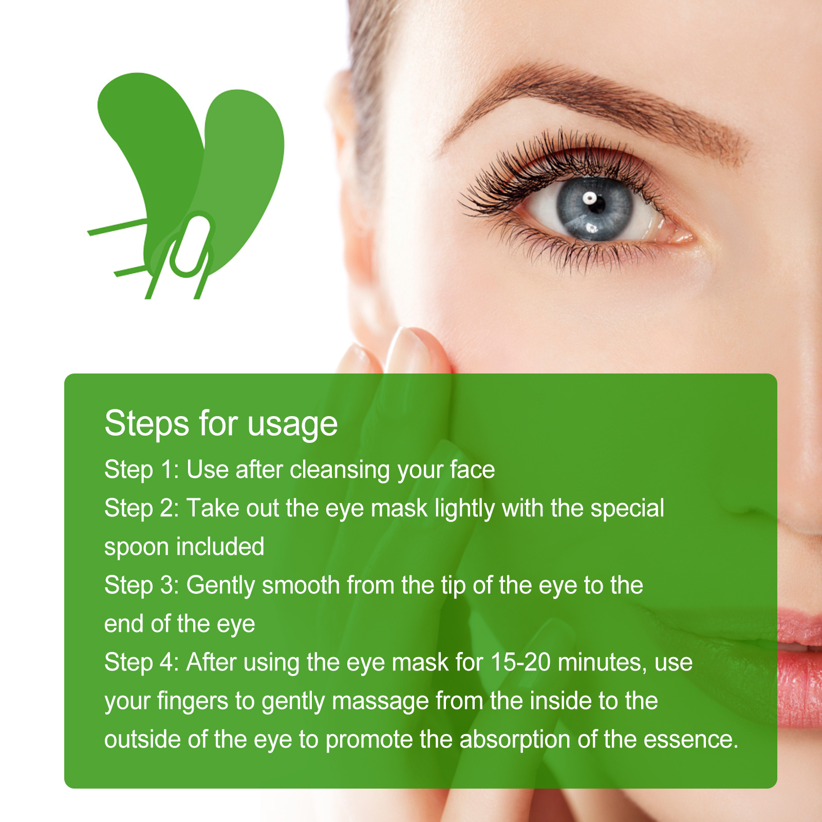 我们的海藻紧致眼膜含有胶原蛋白、角鲨烯、抗坏血酸。它可以滋养眼周娇嫩的肌肤,使眼部变得明亮和充满活力。它的使用方法很简单:第一步:洁面后使用。第二步:用带有专用勺子的勺子轻轻取出眼膜。第三步:从眼尖到眼尾轻轻抚平。第四步:使用眼膜15-20分钟后,用手指从眼内到外轻轻按摩,促进精华的吸收。并且可以减少皱纹和眼部浮肿,改善黑眼圈,亮白均匀眼底区肤色。