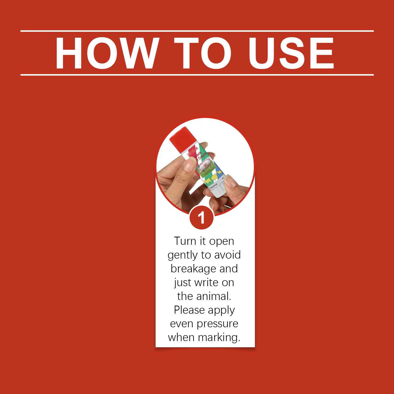 我们的牲畜标记蜡笔含有石蜡、甘油、树脂。它可以标识清晰耐用,耐磨防水,可即时使用,确保管理信息长期不准确。它的使用方法很简单:轻轻打开以避免破损,然后在动物身上写字。打标时请用力均匀。握感舒适,减少手部疲劳,轻松上手,使用并实现高效管理。